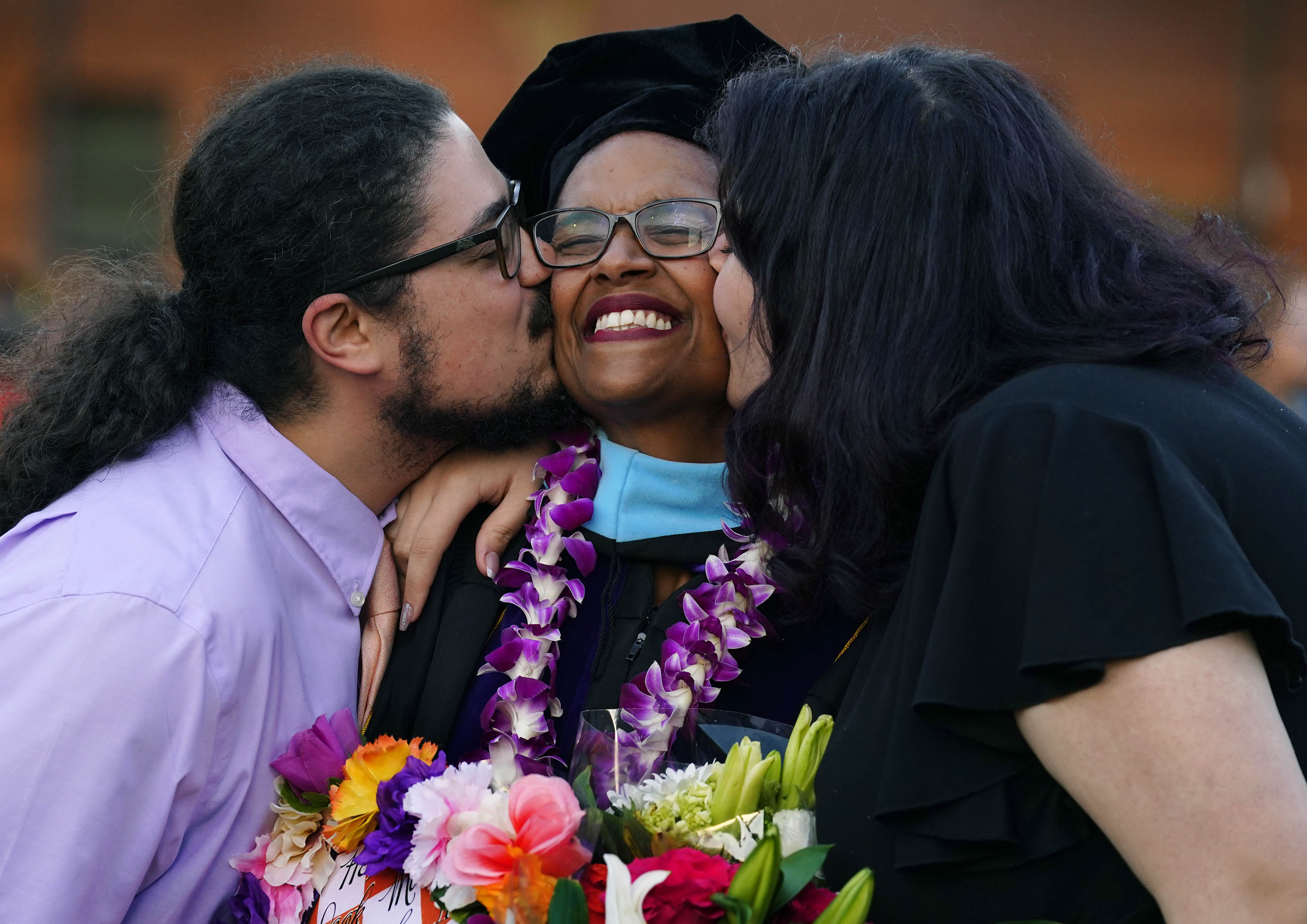 A graduate gets kisses from her children following the Wednesday afternoon fall commencement ceremony at Global Credit Union Arena. -