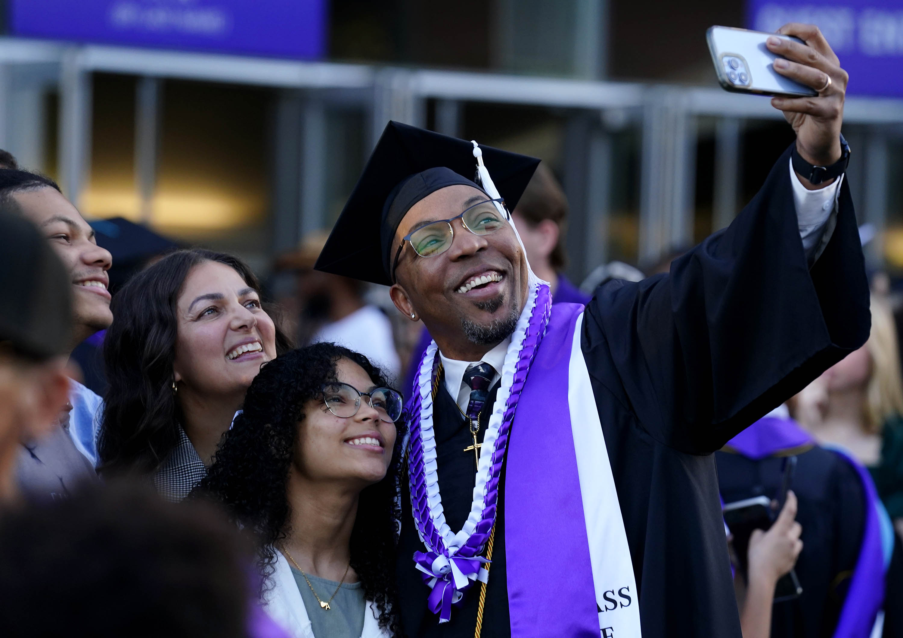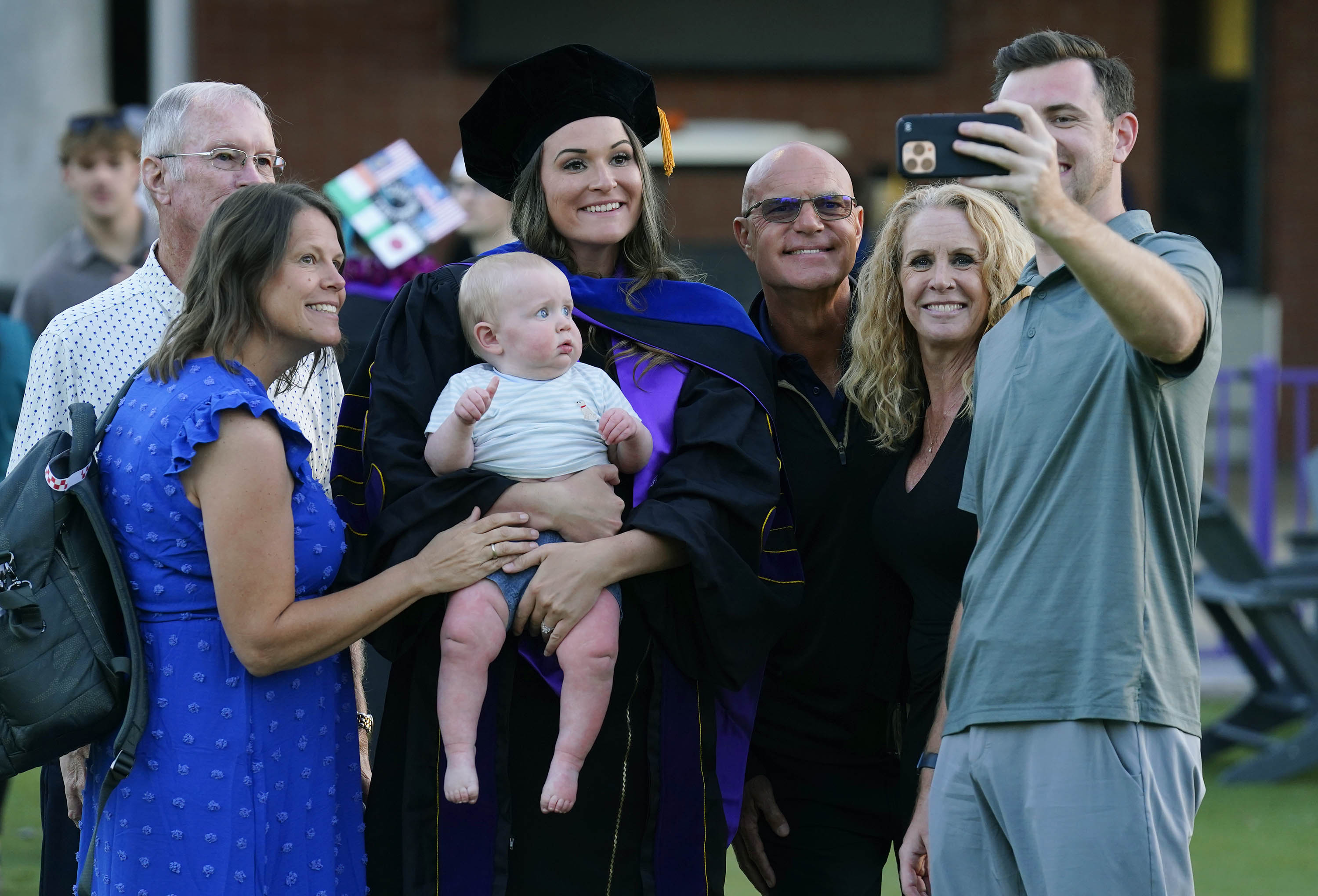 A graduate takes a selfie with family members following the Wednesday afternoon commencement ceremony for online and cohort students at Global Credit Union Arena.