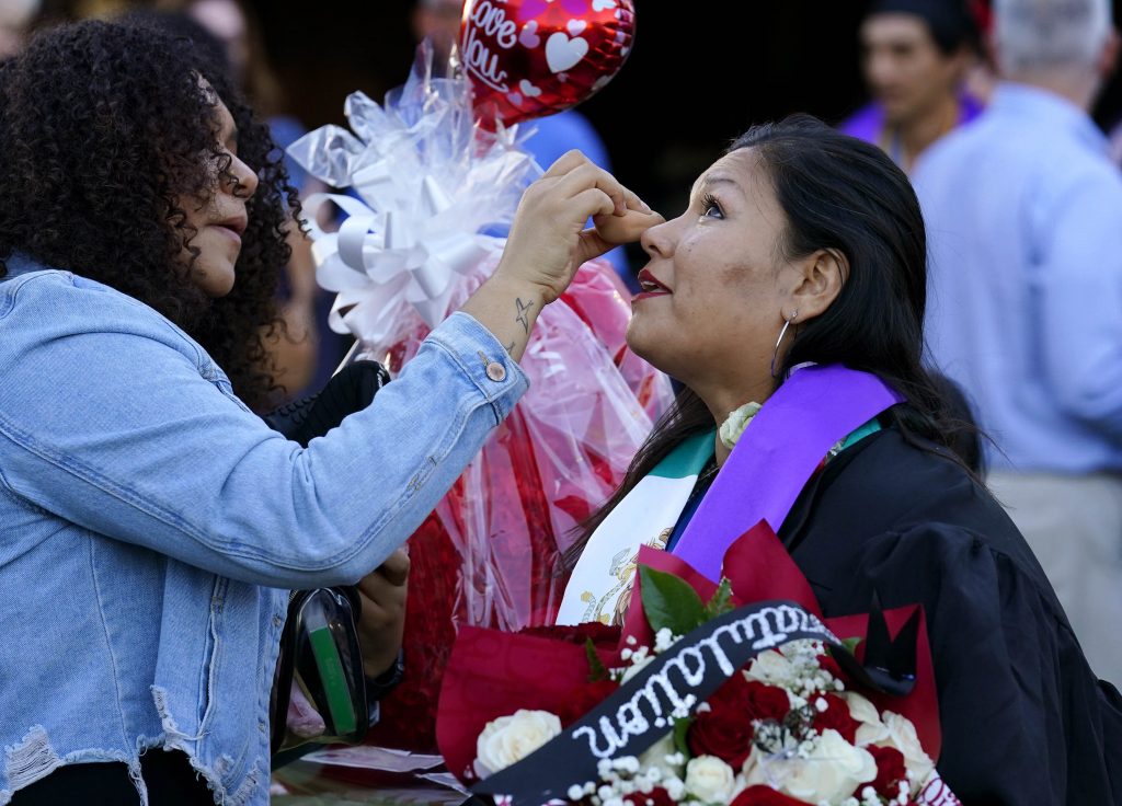 A family member helps apply makeup to a graduate during the Wednesday afternoon fall commencement ceremony. -