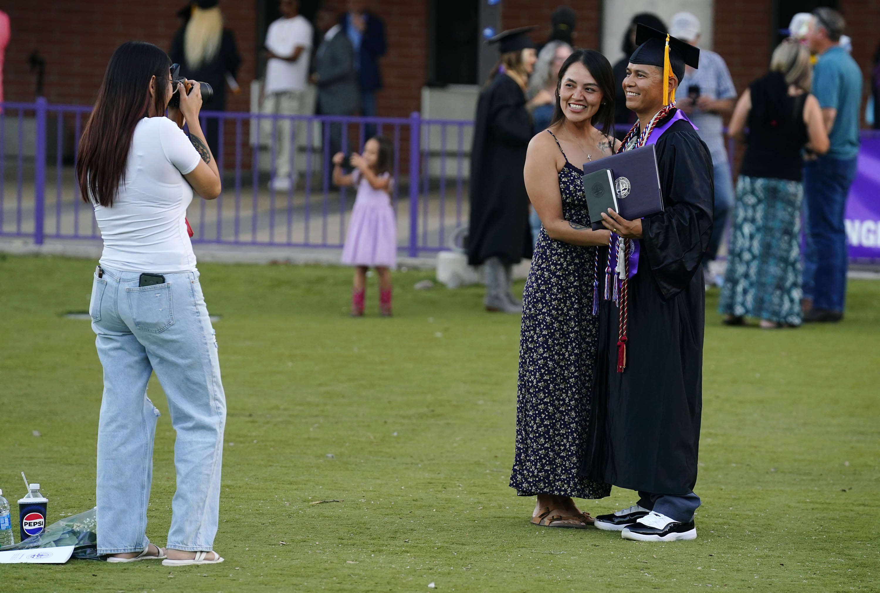 Graduates take photos with family members on the Quad following the Wednesday afternoon commencement ceremony for online and cohort students. -