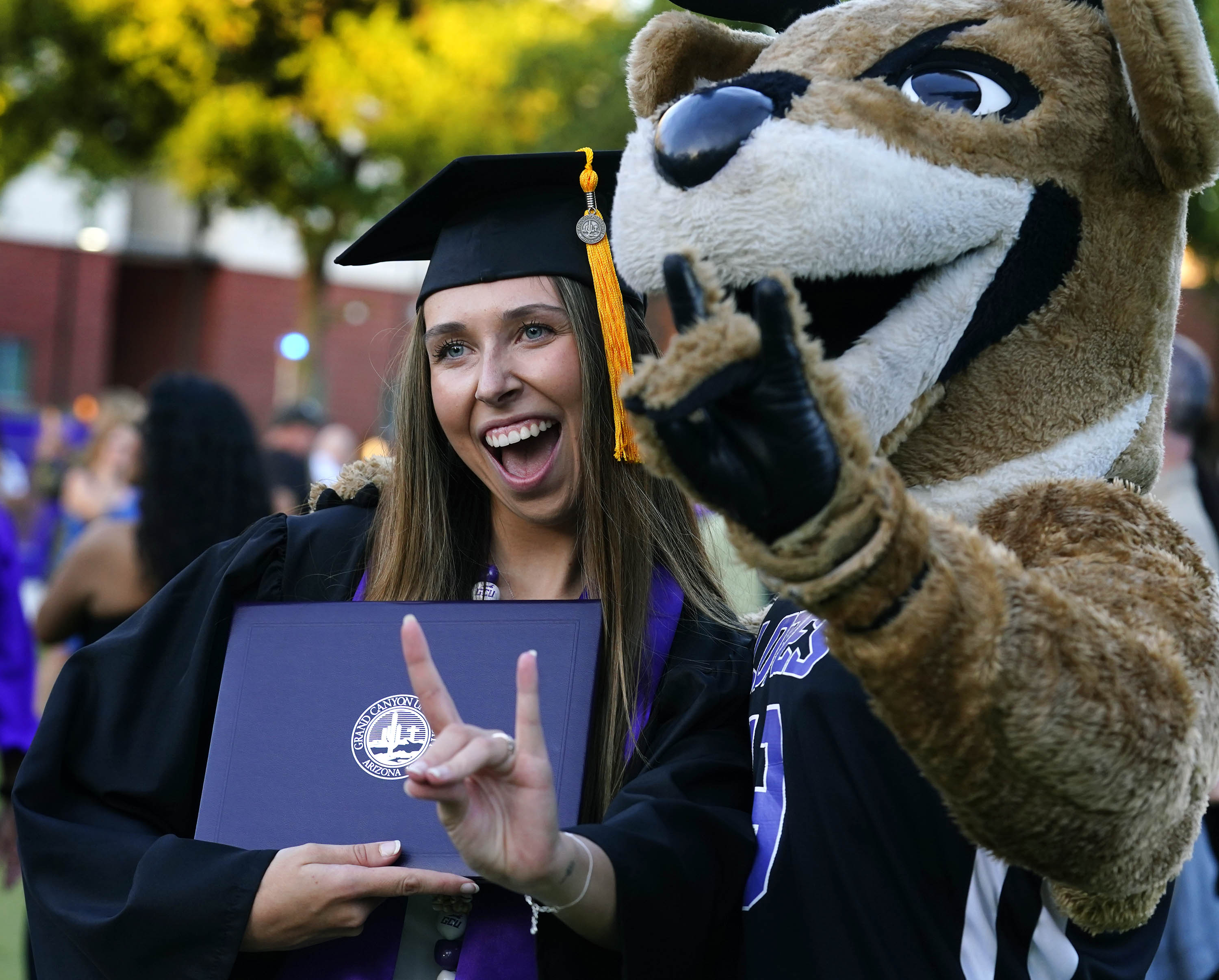 A graduate takes a photo with Thunder following the Wednesday afternoon fall commencement ceremony at Global Credit Union Arena. -