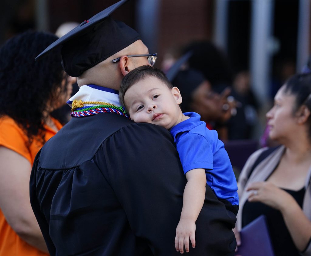 The young son of a graduate is wiped out after the Wednesday afternoon commencement ceremony for online and cohort students. -