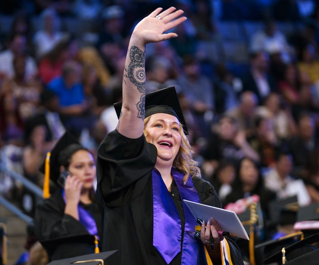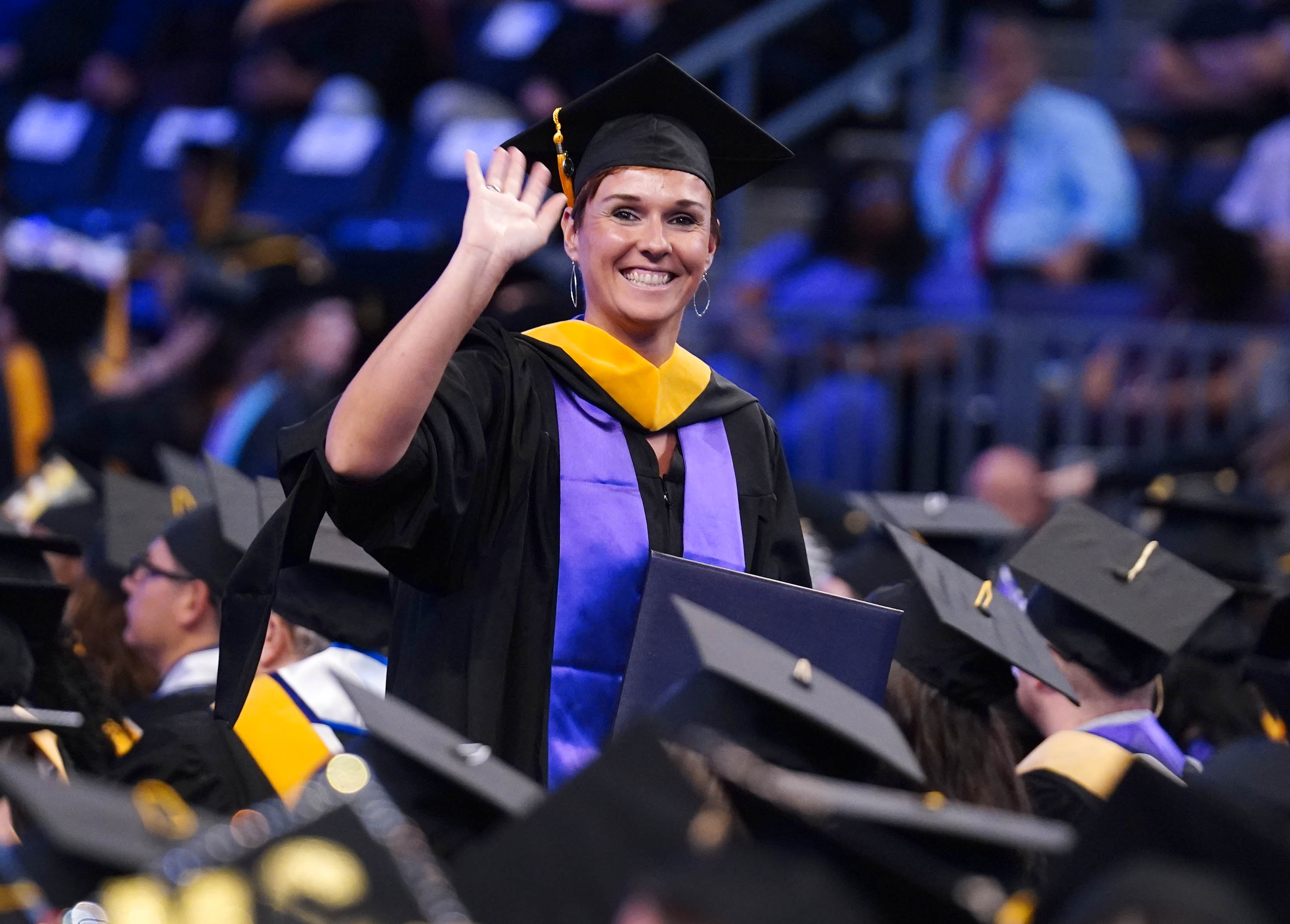 A graduate waves to family and friends after receiving her diploma during the Wednesday morning fall commencement ceremony at Global Credit Union Arena on Oct. 15, 2025. -