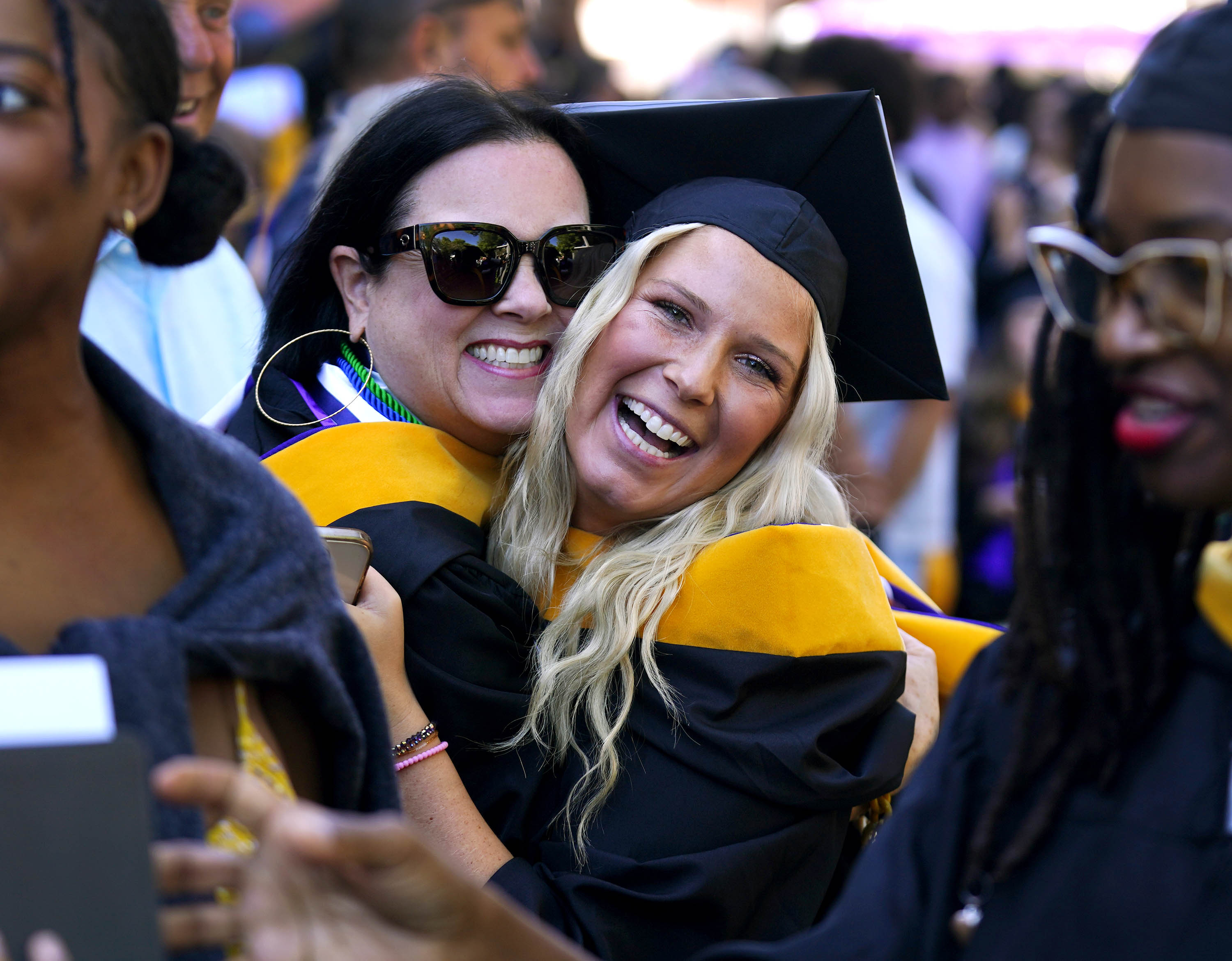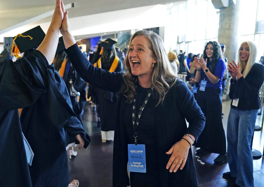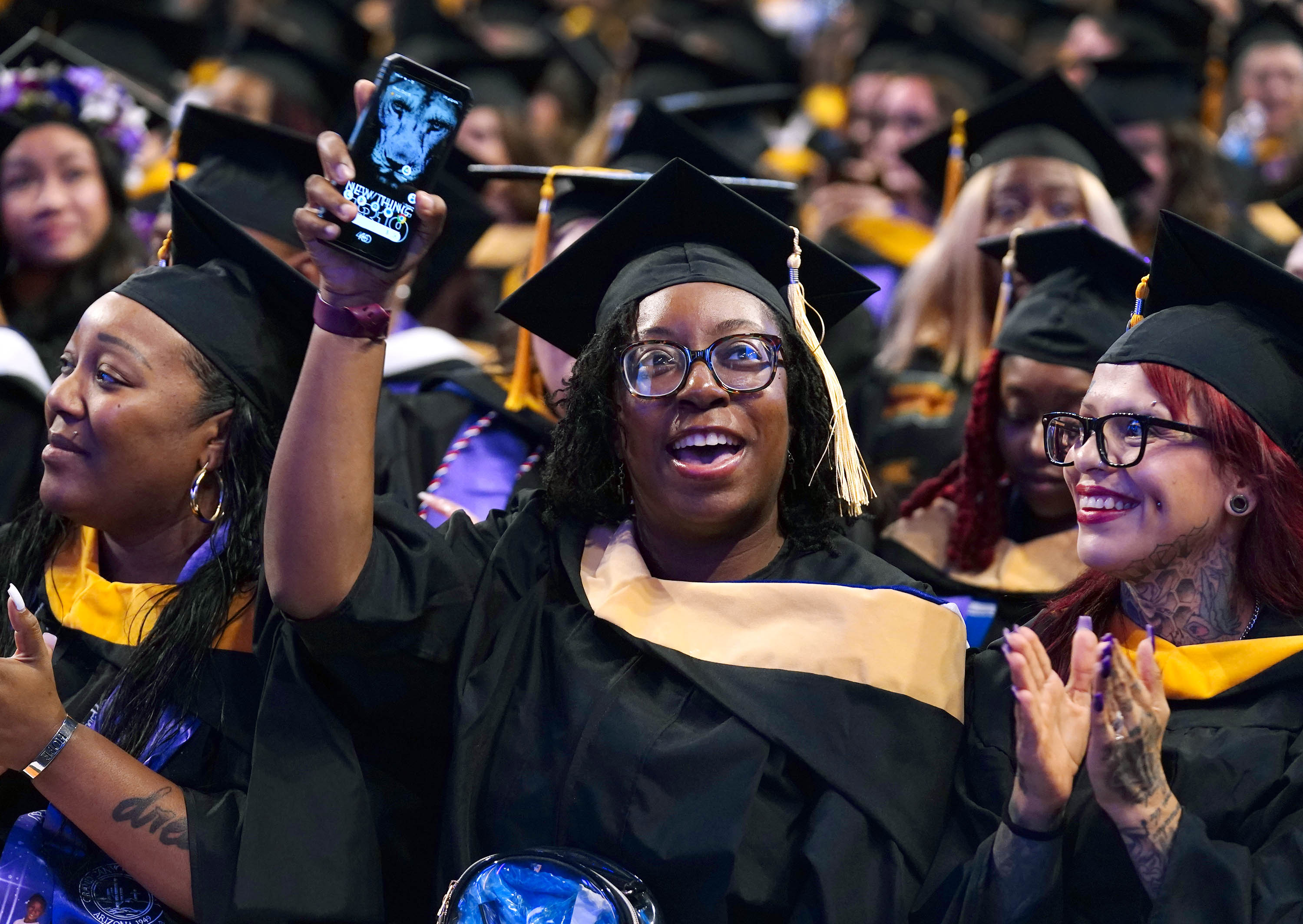 Graduates are excited for their big day at Wednesday morning's commencement ceremony for online and cohort students at Global Credit Union Arena on Oct. 15, 2025. -
