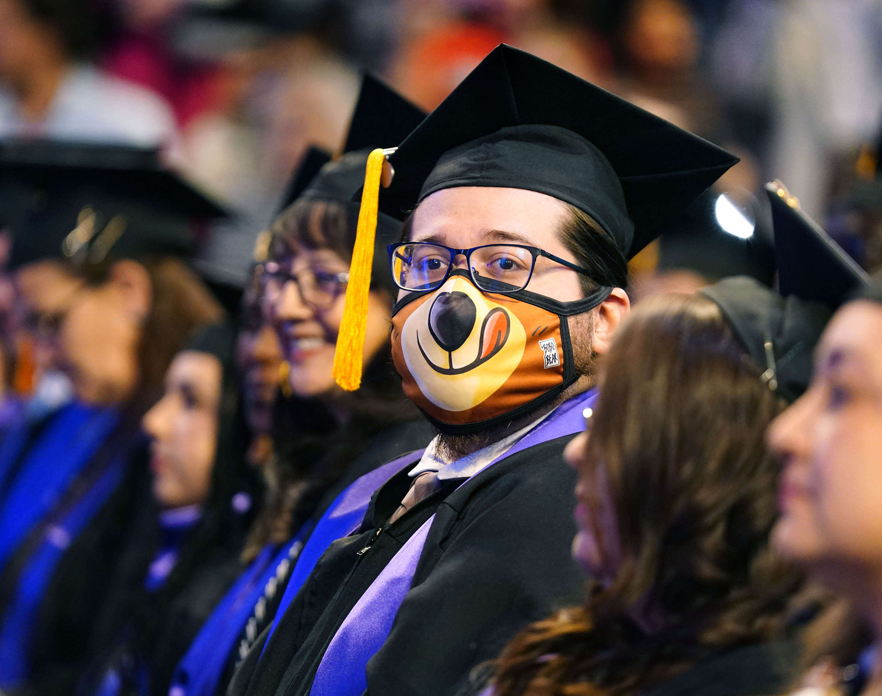 A masked online graduate during the Wednesday morning commencement ceremony for online and cohort students at Global Credit Union Arena on Oct. 15, 2025. -