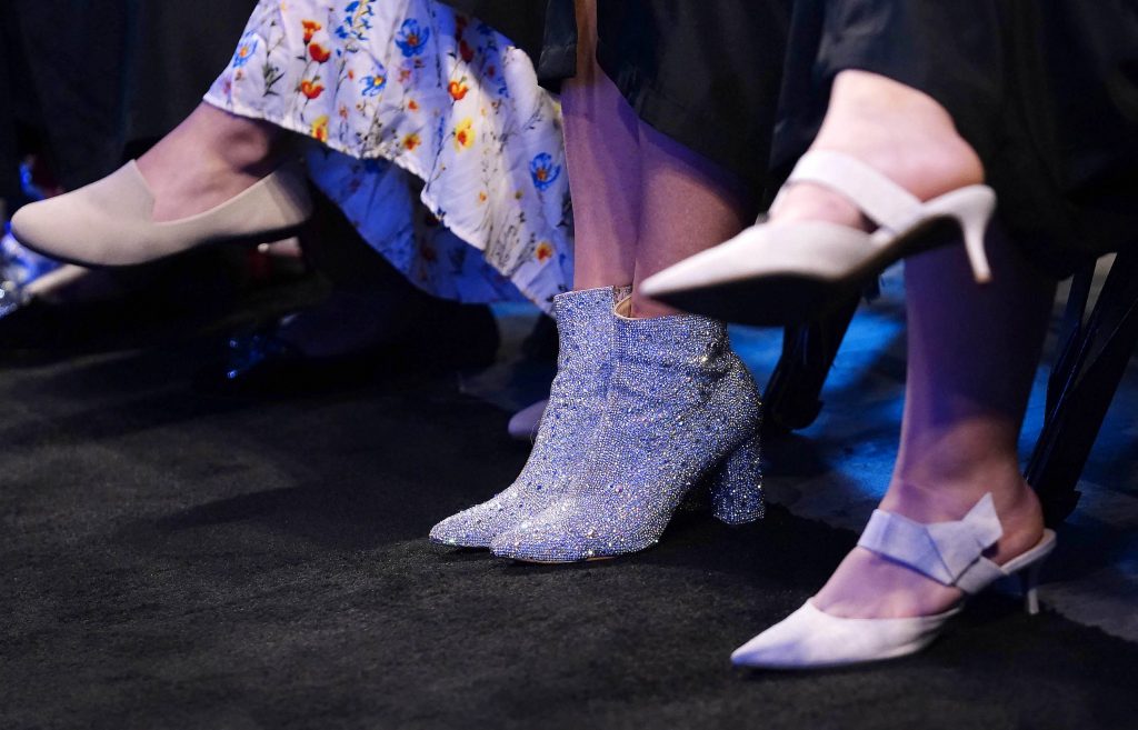 This graduate adds a bit of sparkle to her commencement walk with her footwear during the Wednesday morning fall commencement ceremony at Global Credit Union Arena on Oct. 15, 2025. -