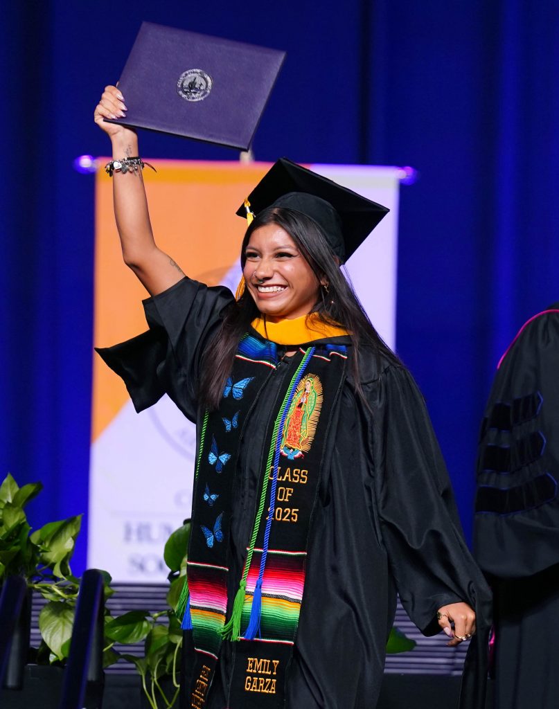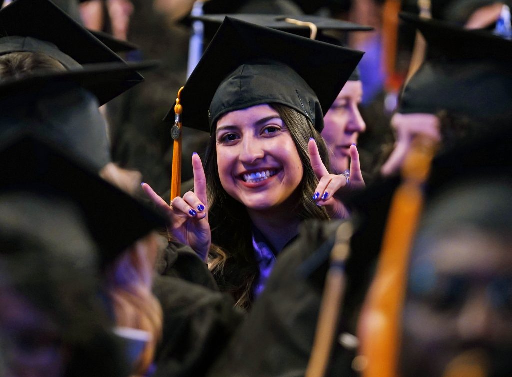 A graduate flashes a Lopes-Up during the Wednesday morning fall commencement ceremony at Global Credit Union Arena on Oct. 15, 2025. -