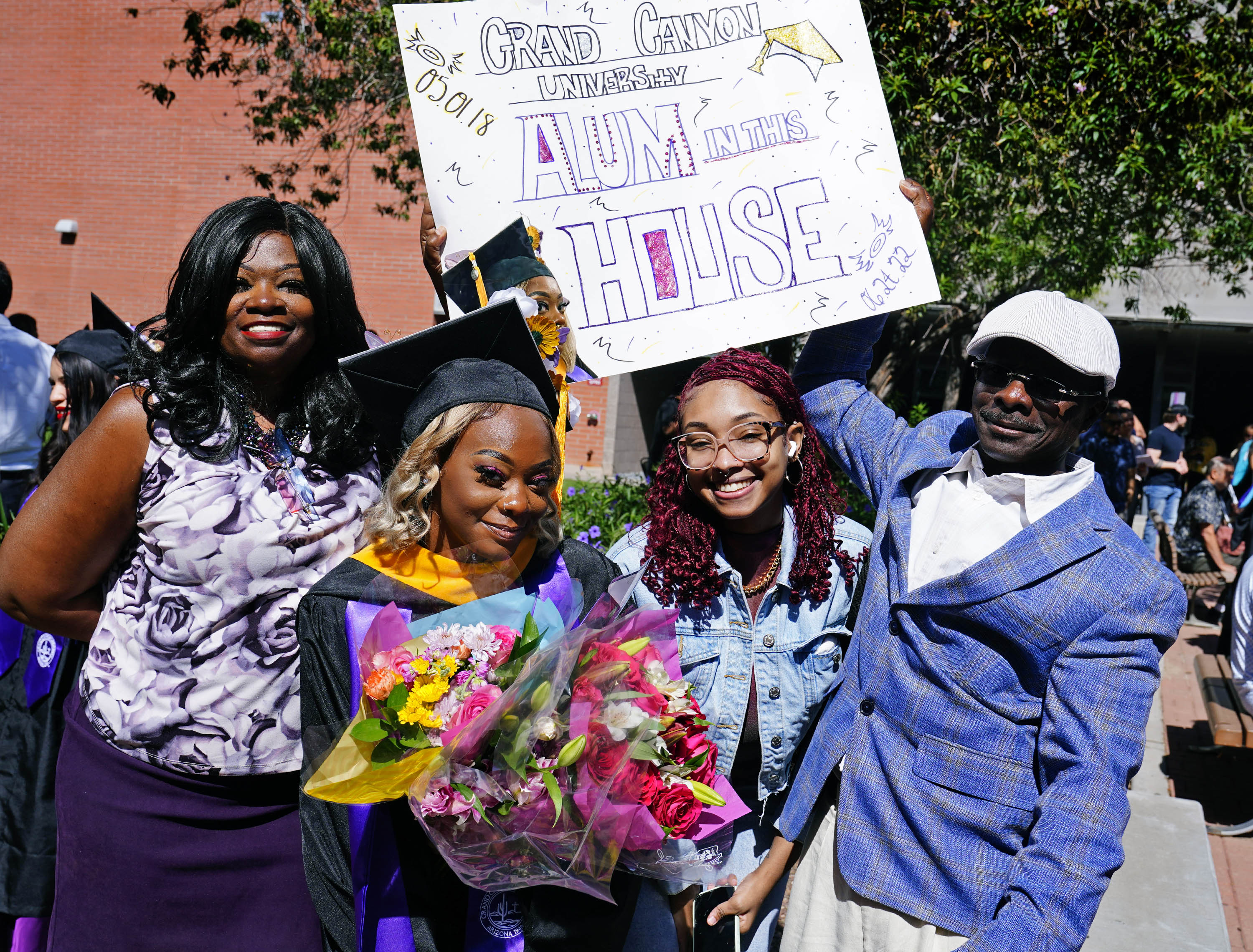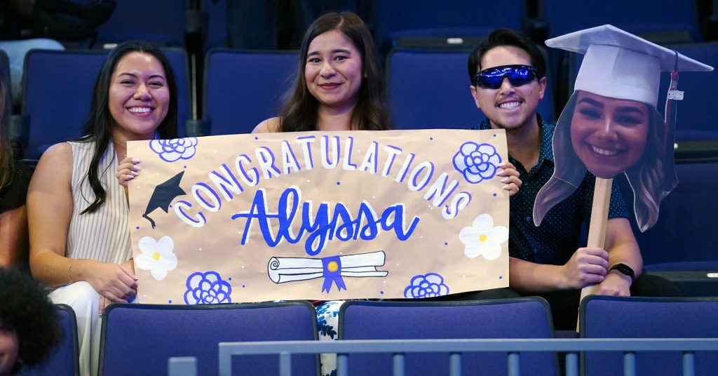 Friends and family members hold up a sign for their graduate during the Wednesday morning commencement ceremony for online and cohort students at Global Credit Union Arena on Oct. 15, 2025. -
