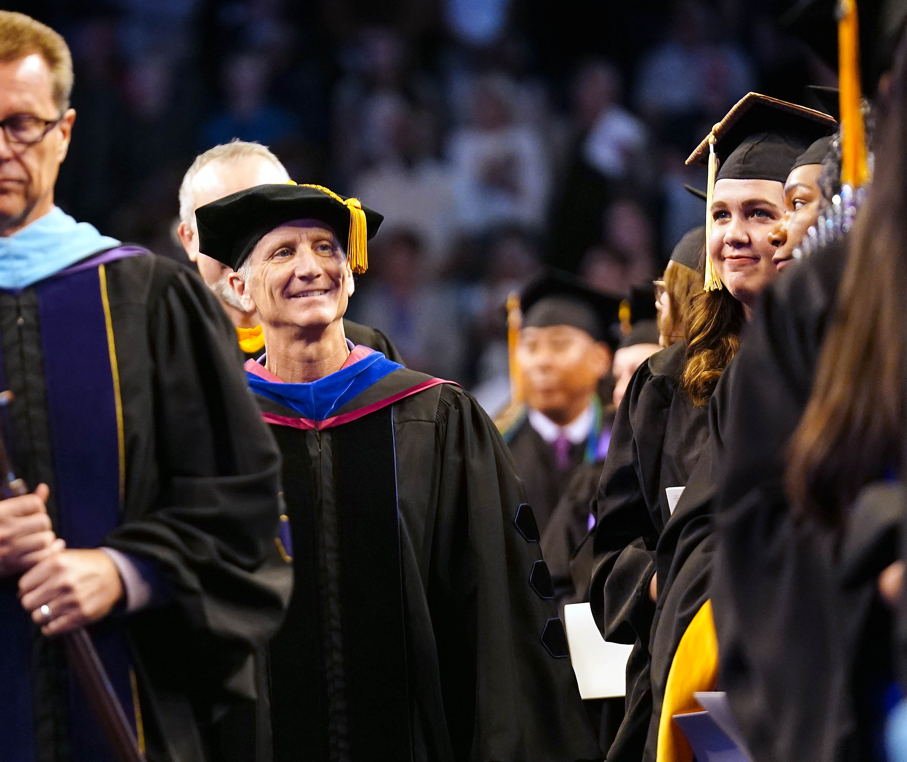 University Provost Dr. Randy Gibb makes his way to the stage with the processional during the Wednesday morning fall commencement ceremony at Global Credit Union Arena on Oct. 15, 2025. -