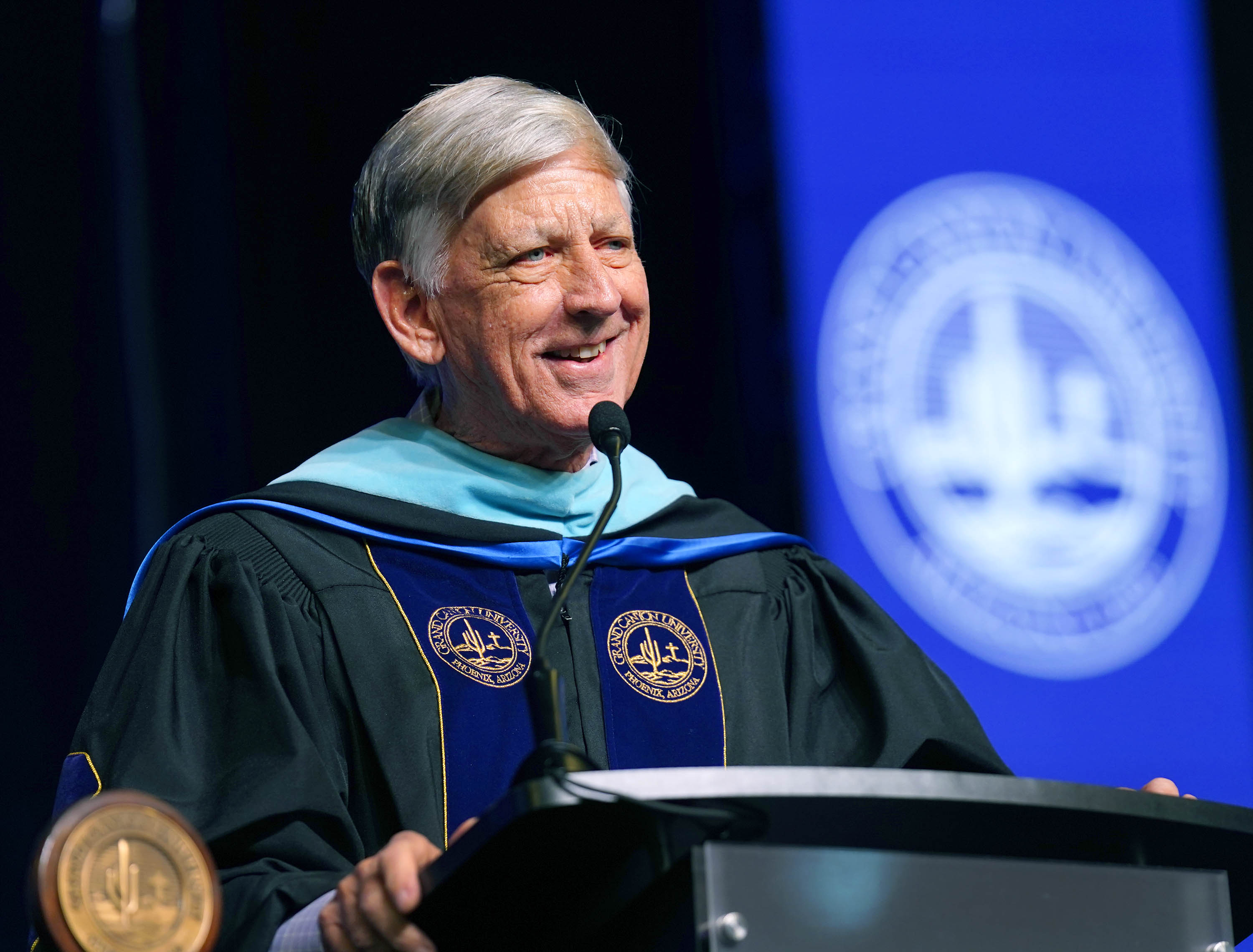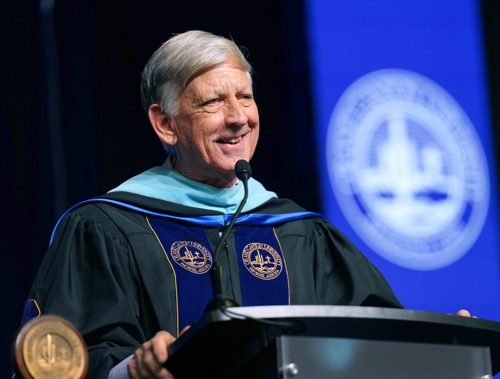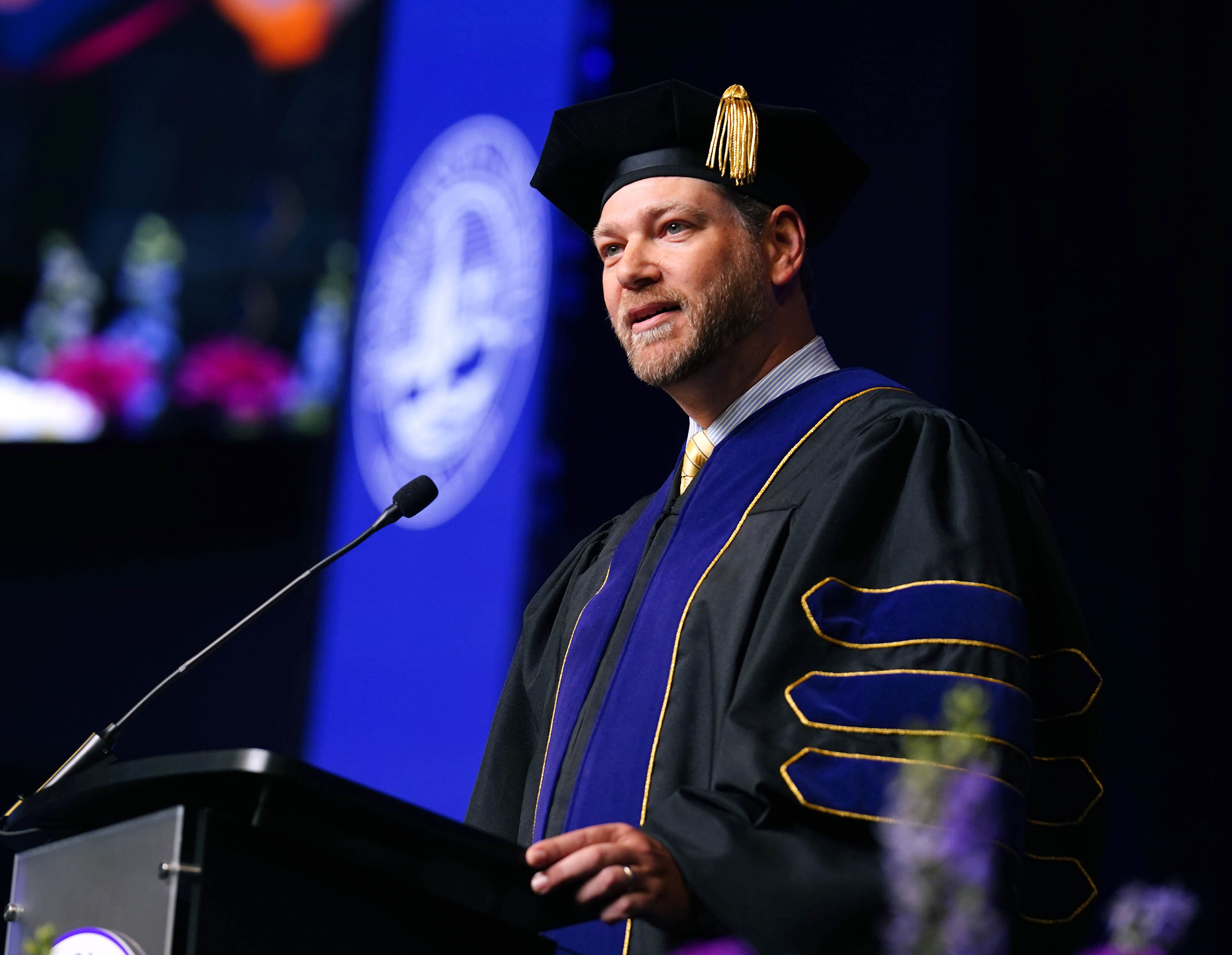 Student speaker Dr. Jon Shacklett addresses his fellow graduates during the Wednesday morning commencement ceremony for online and cohort students at Global Credit Union Arena on Oct. 15, 2025. -