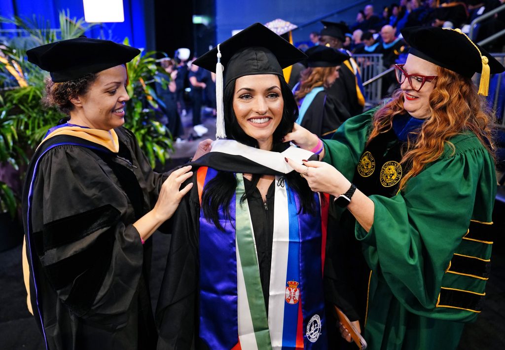 Master's graduate Izabela Fogarasi gets hooded before walking across the stage during the Wednesday morning fall commencement ceremony at Global Credit Union Arena on Oct. 15, 2025. -