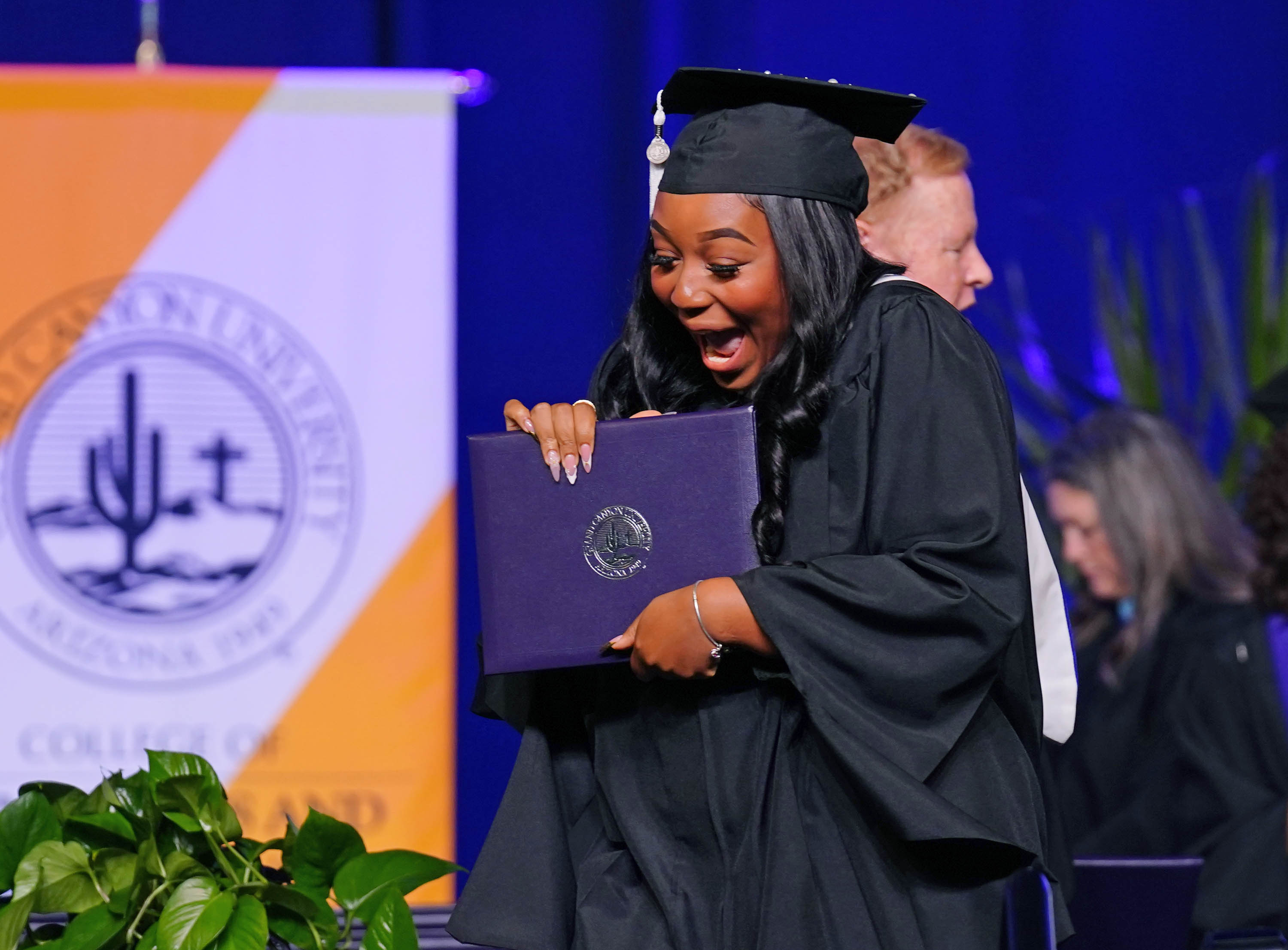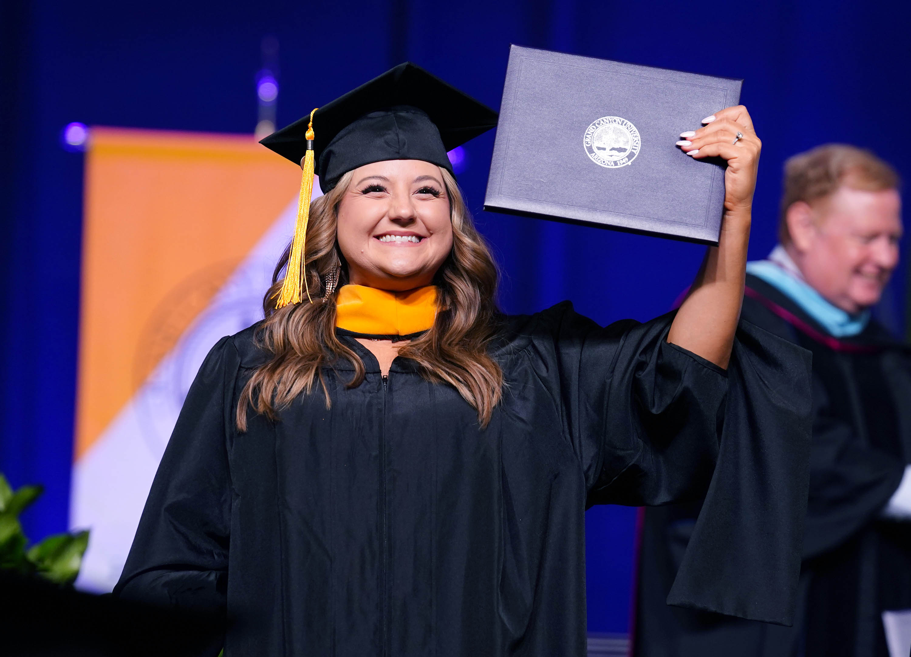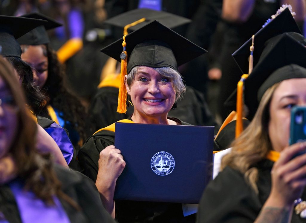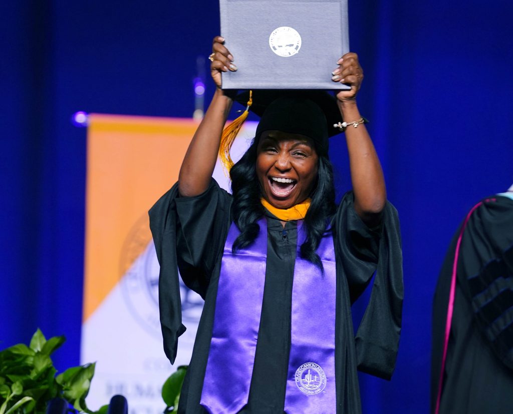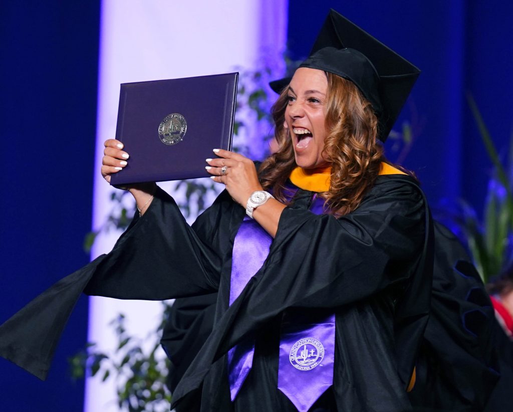 A graduate displays her diploma during the Wednesday morning commencement ceremony for online and cohort students at Global Credit Union Arena on Oct. 15, 2025. -