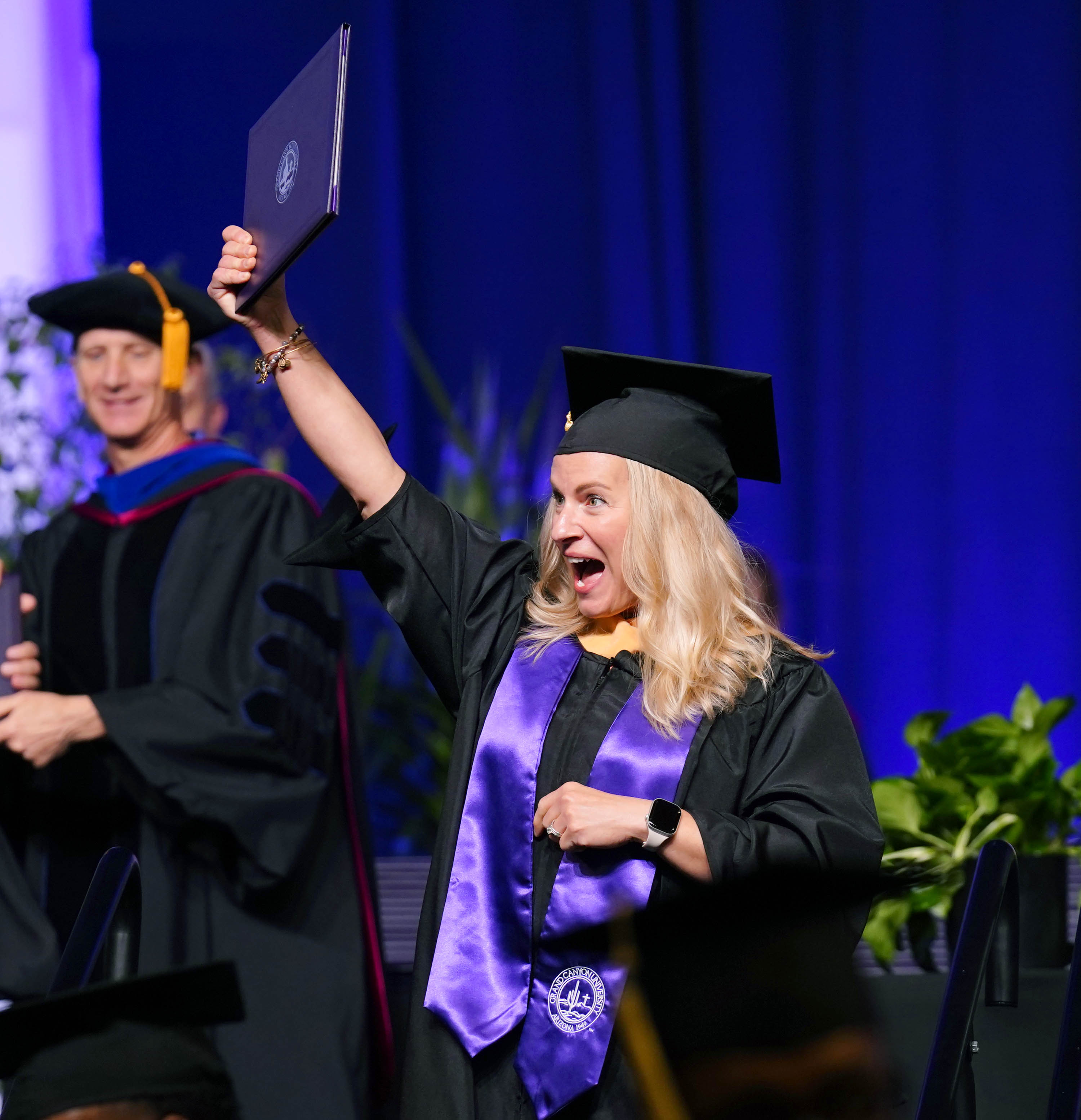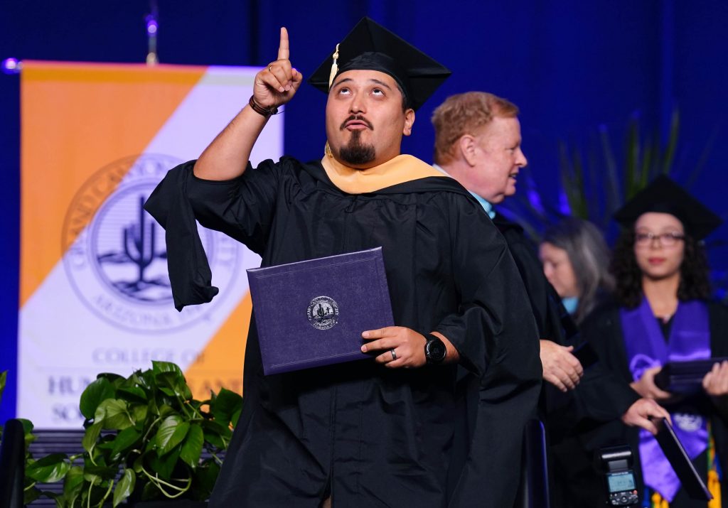 A graduate gestures skyward after receiving his diploma during the Wednesday morning commencement ceremony for online and cohort students at Global Credit Union Arena on Oct. 15, 2025. -