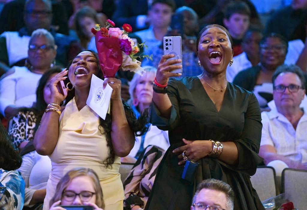Family members cheer for their graduate during the Wednesday morning fall commencement ceremony at Global Credit Union Arena on Oct. 15, 2025. -