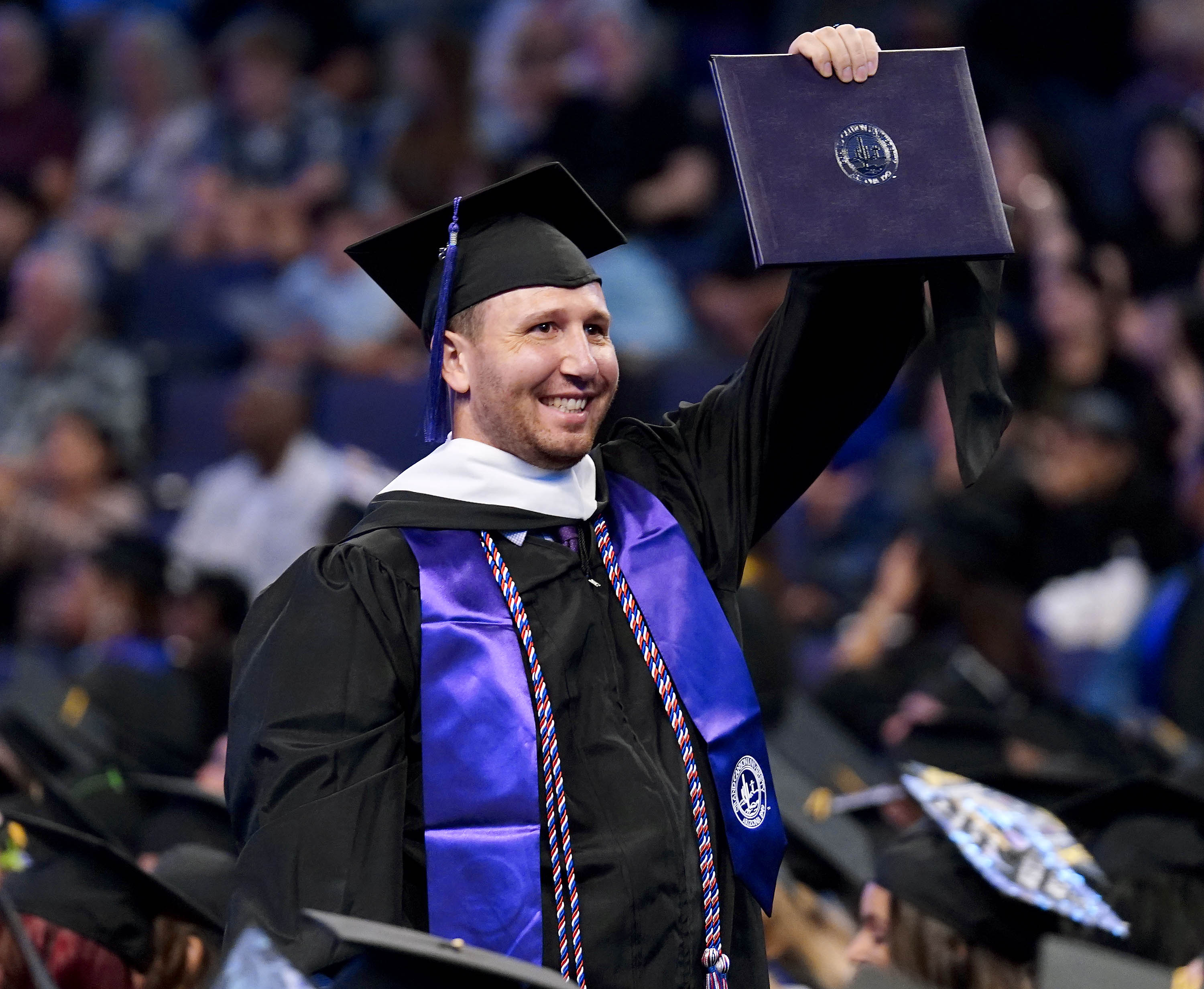 A graduate shows off his diploma to family members in the crowd during the Wednesday morning fall commencement ceremony at Global Credit Union Arena on Oct. 15, 2025. -