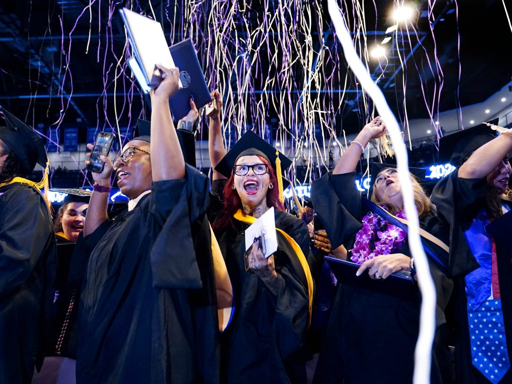 Graduates celebrate under a shower of confetti streamers during the Wednesday morning commencement ceremony for online and cohort students at Global Credit Union Arena on Oct. 15, 2025. -