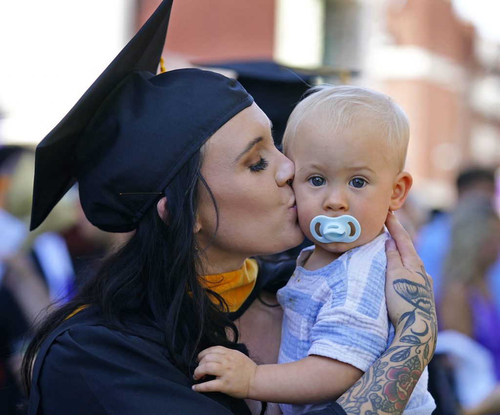 A graduate kisses her son following the Wednesday morning commencement ceremony for online and cohort students at Global Credit Union Arena on Oct. 15, 2025. -