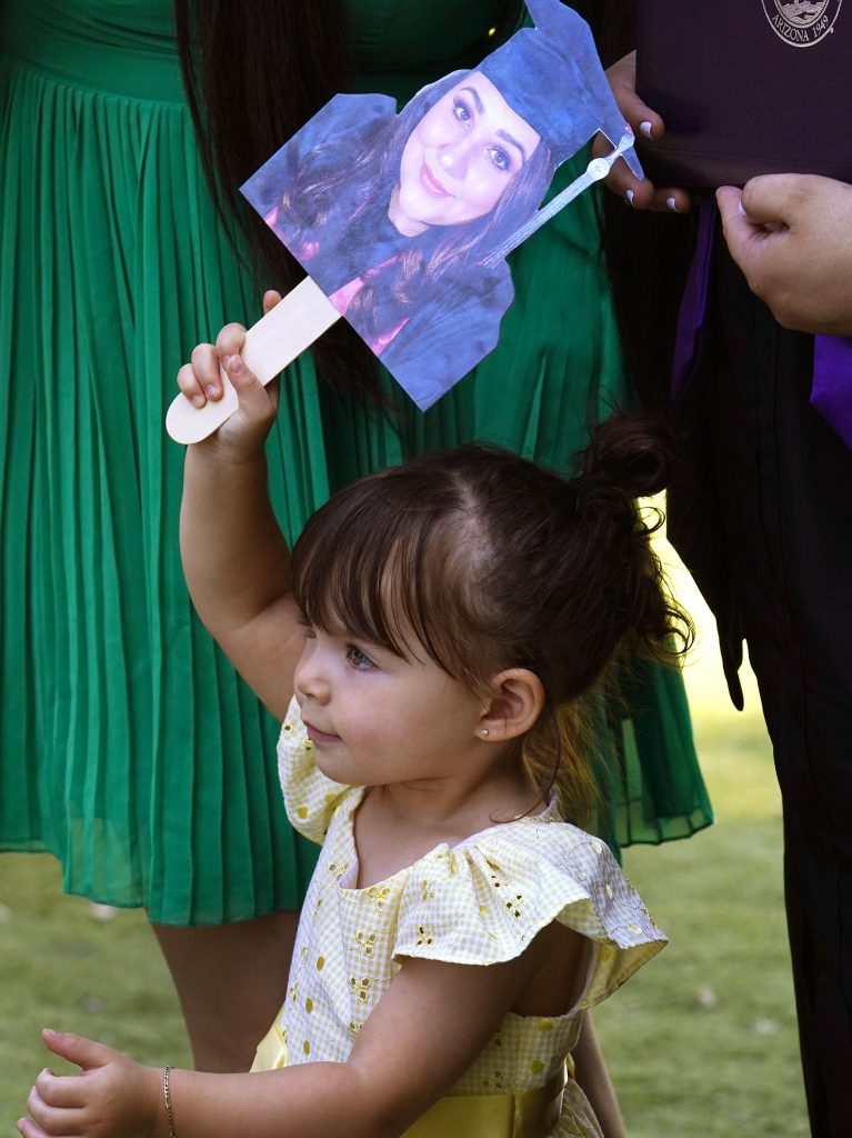 A young family member holds up a picture of her graduate following the Wednesday morning commencement ceremony for online and cohort students at Global Credit Union Arena on Oct. 15, 2025. -