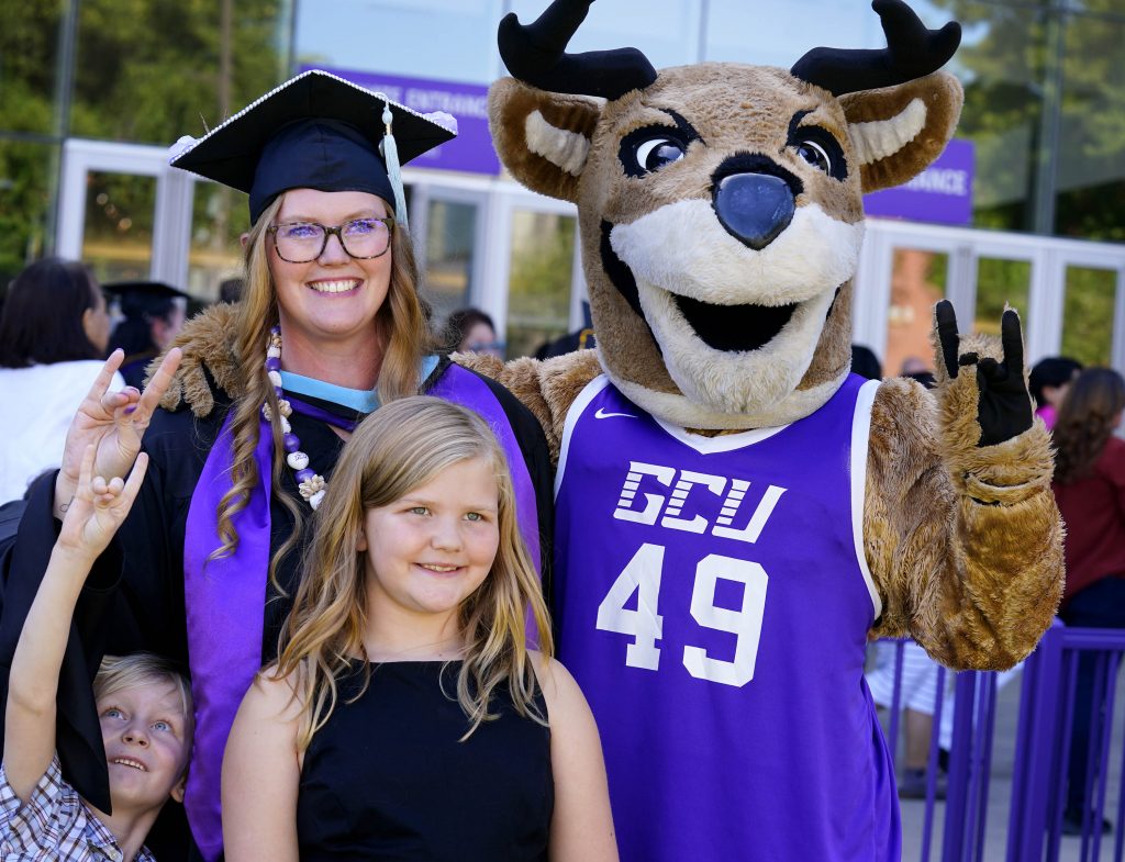 Graduates and family members take photos with Thunder following the Wednesday morning fall commencement ceremony at Global Credit Union Arena on Oct. 15, 2025. -