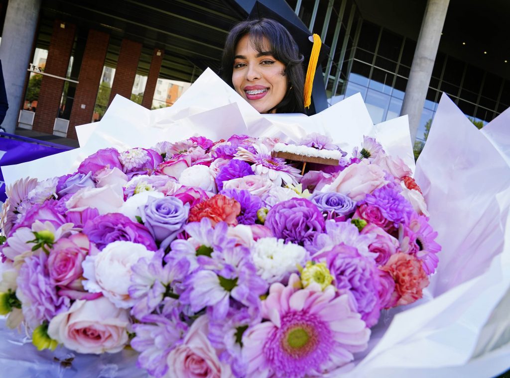 A graduate with a huge bouquet of flowers following the Wednesday morning commencement ceremony for online and cohort students at Global Credit Union Arena on Oct. 15, 2025.