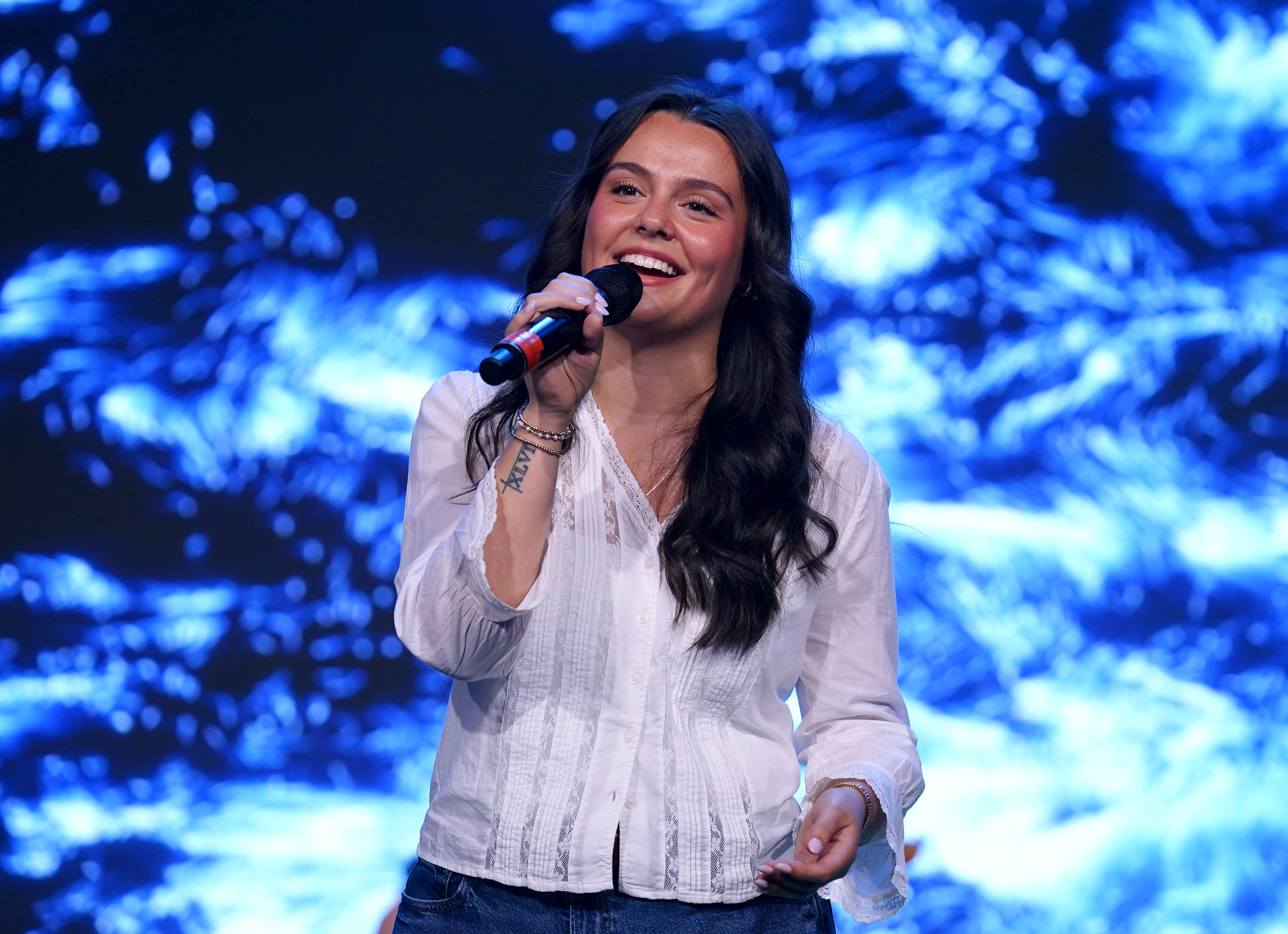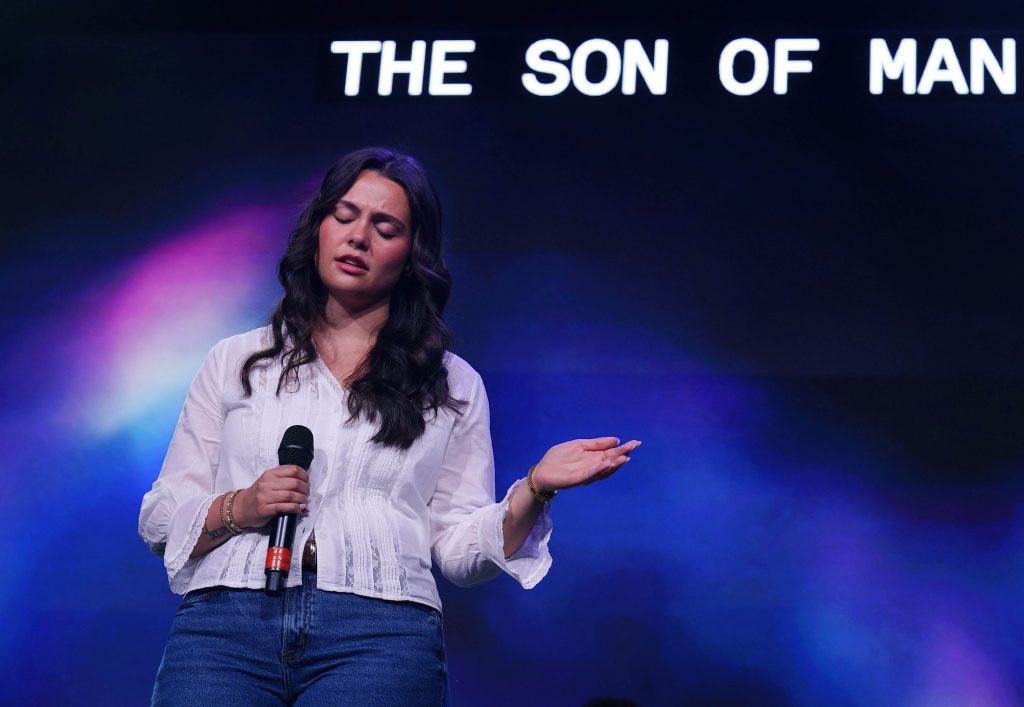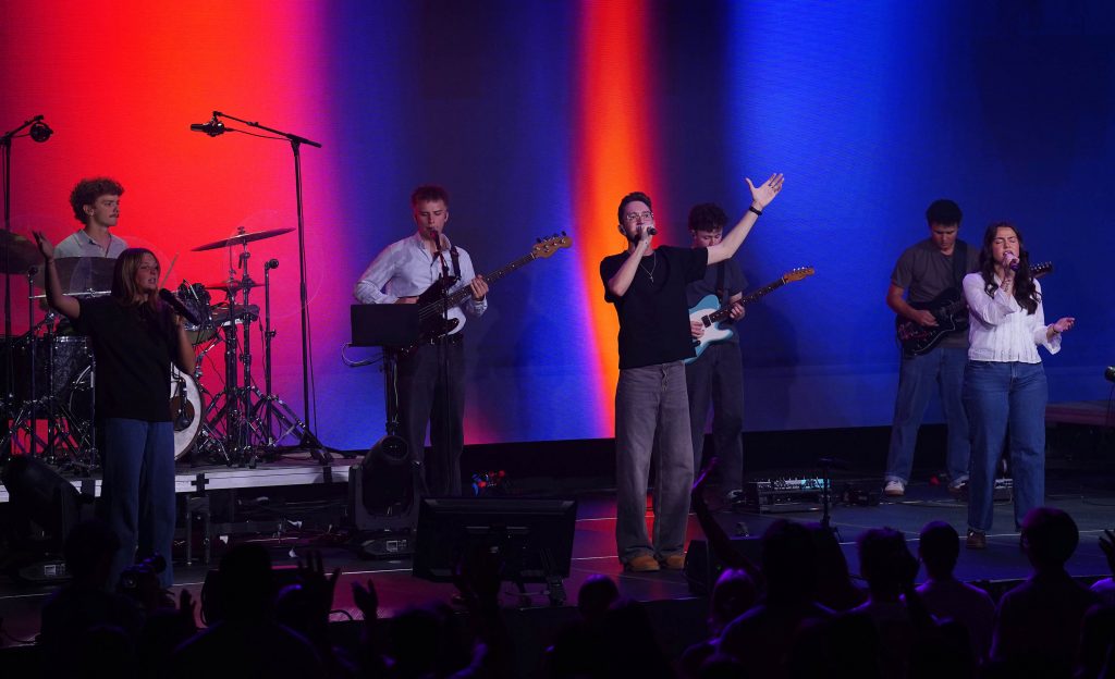 Bailey Hartman and the Worship team take the stage at Monday’s musical worship Chapel at Global Credit Union Arena. April 6, 2026. -