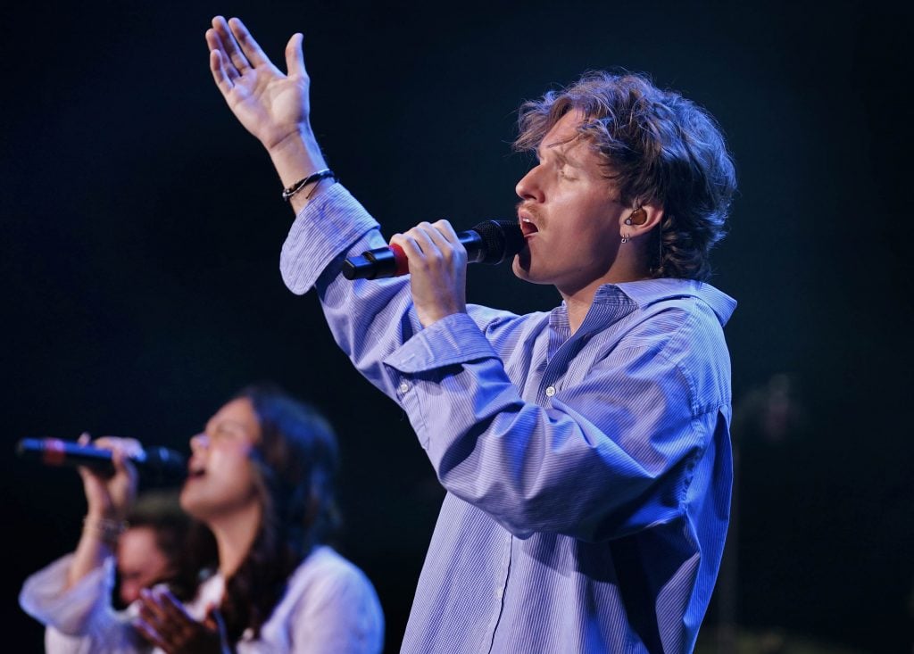 Kaleb Zetterberg and the Worship team perform during Monday’s musical worship Chapel at Global Credit Union Arena. April 6, 2026. -
