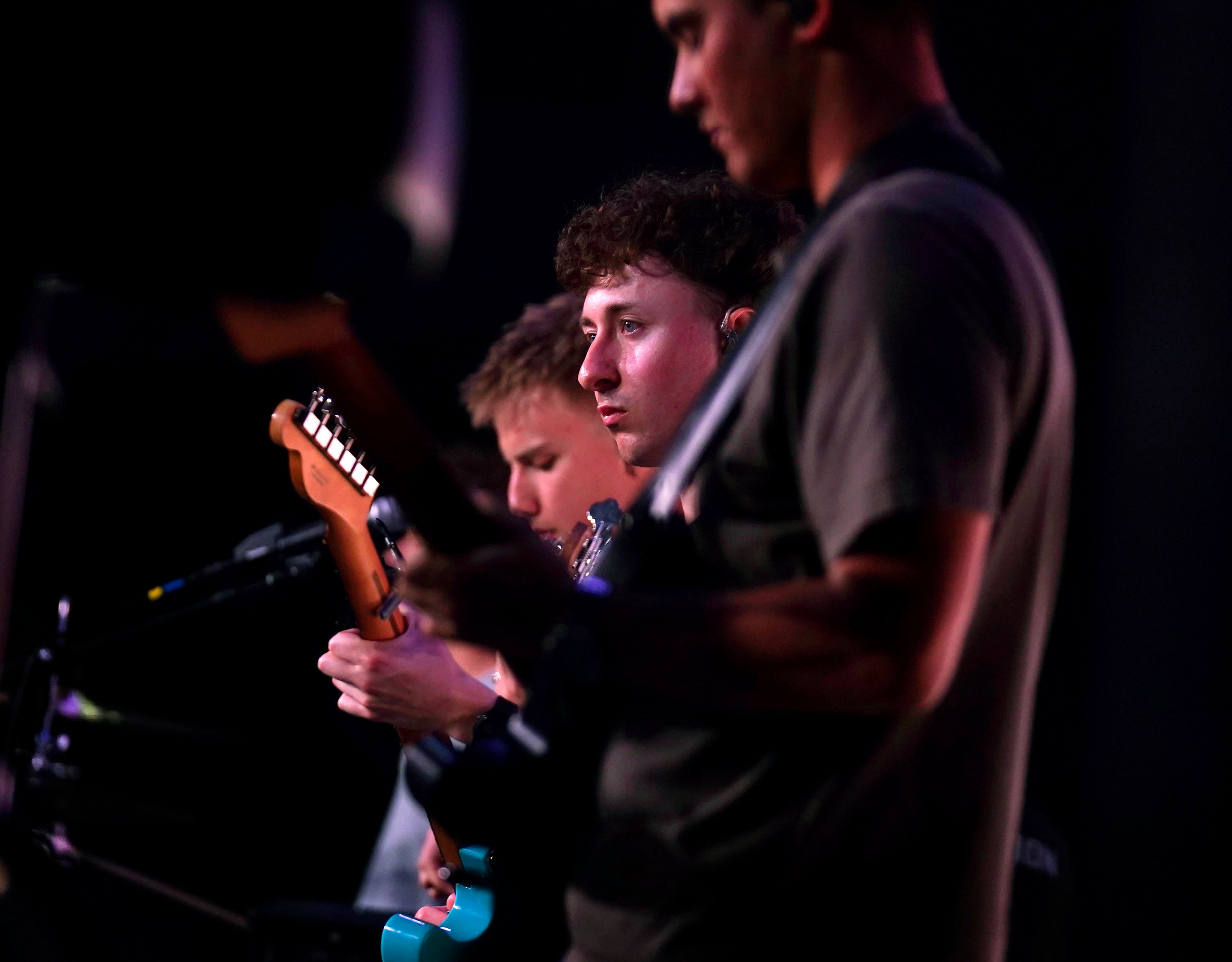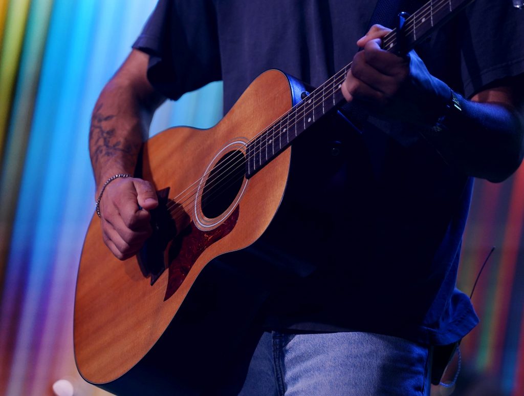 Worship Team guitarist Jack Goshkarian plays during Monday’s musical worship Chapel at Global Credit Union Arena. April 6, 2026. -