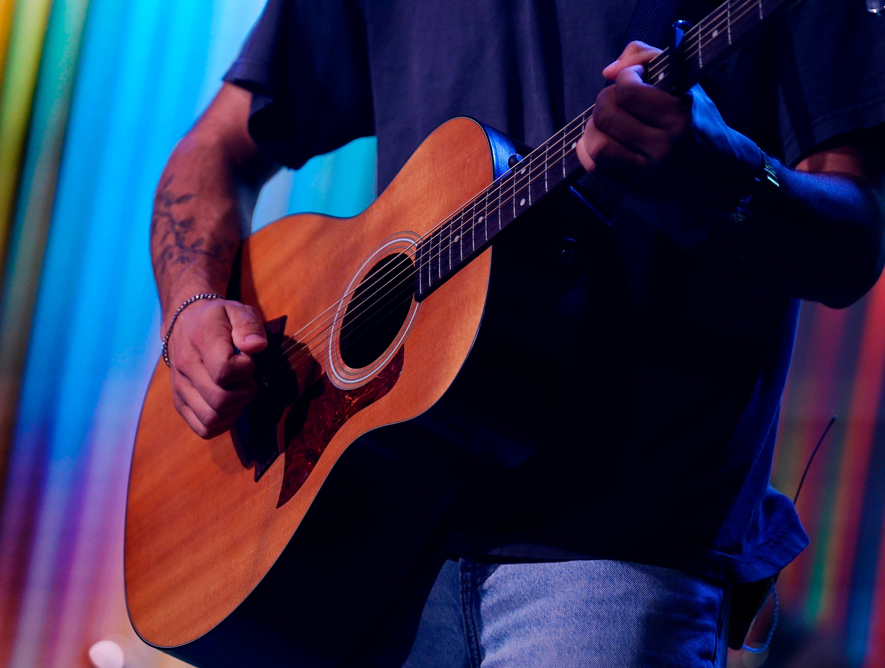 Worship team leader Nathan Padilla plays the acoustic guitar during Monday’s musical worship Chapel at Global Credit Union Arena. April 6, 2026. -