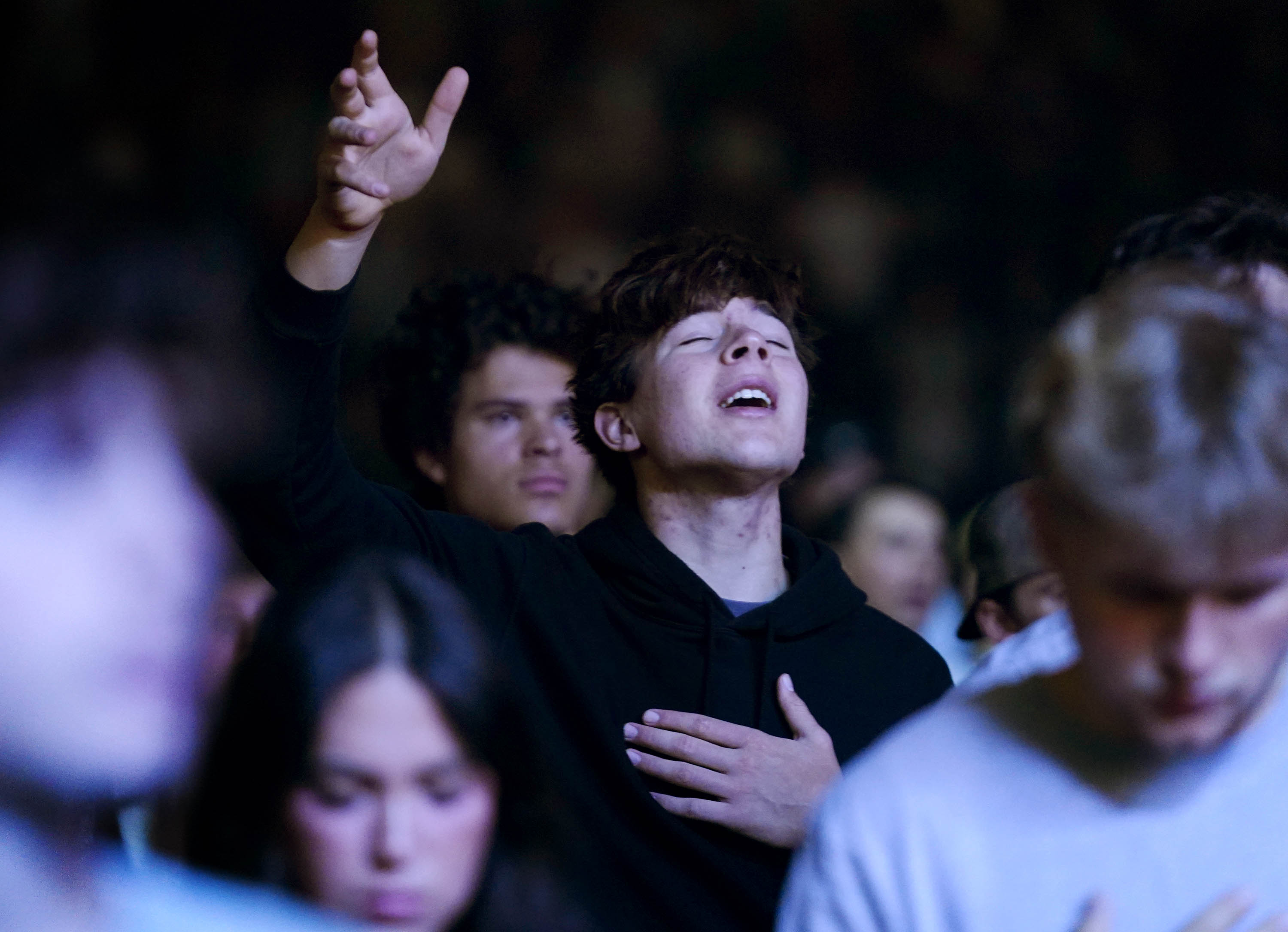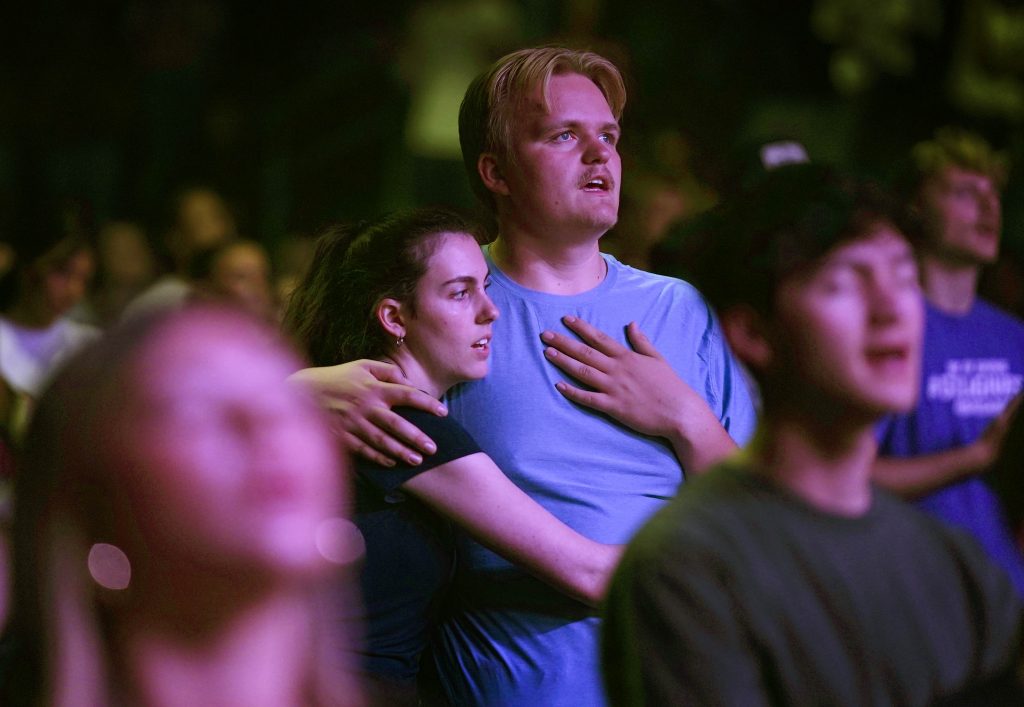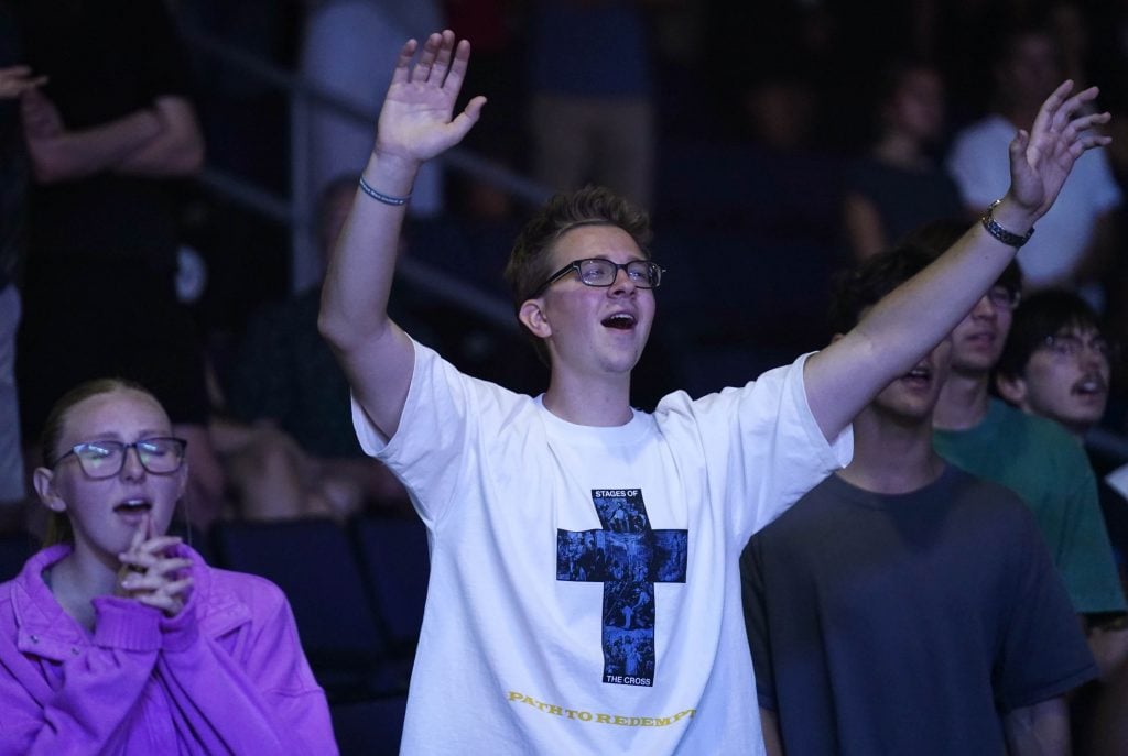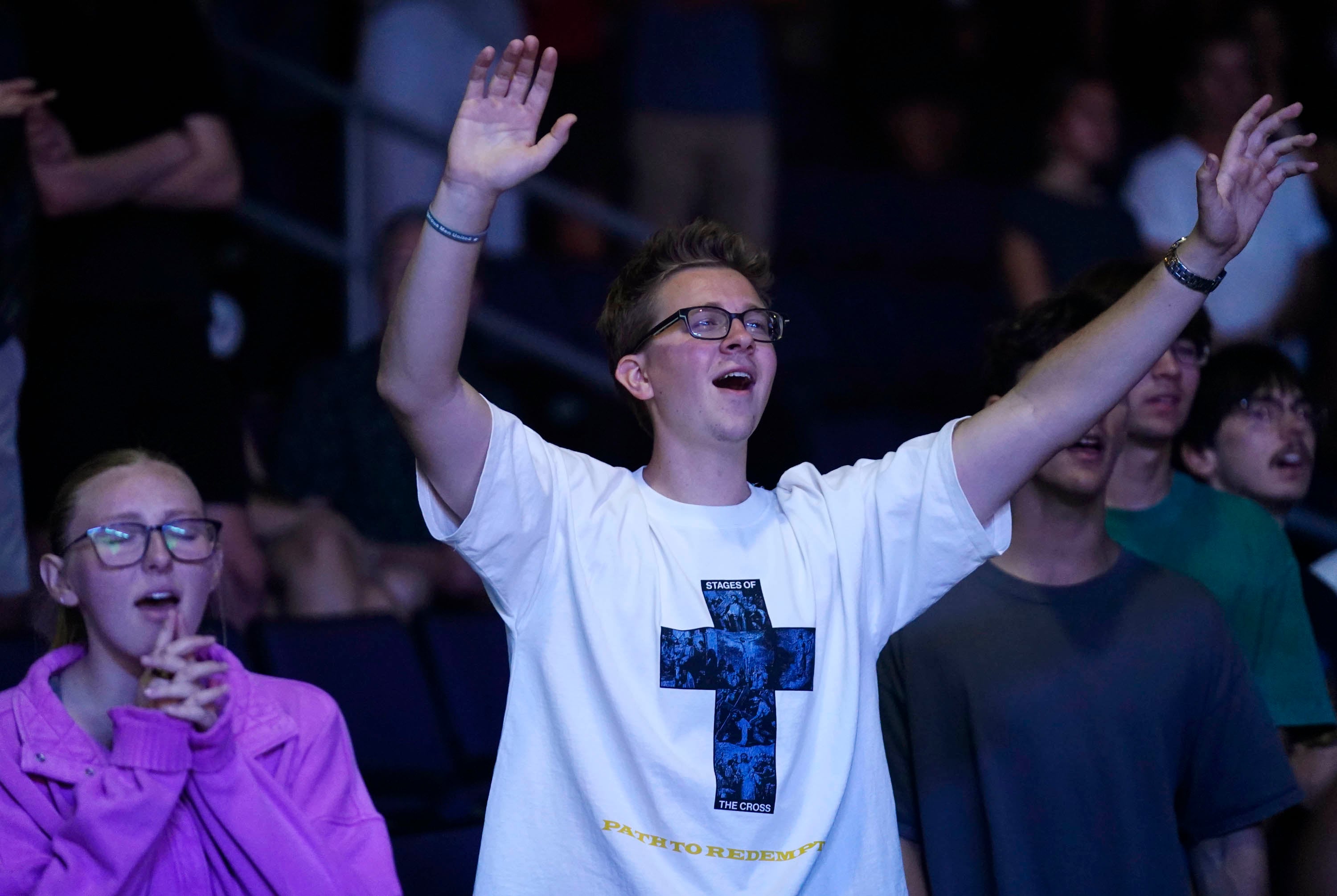 Students are moved as they sing along with the Worship team during Monday’s musical worship Chapel at Global Credit Union Arena. April 6, 2026. -