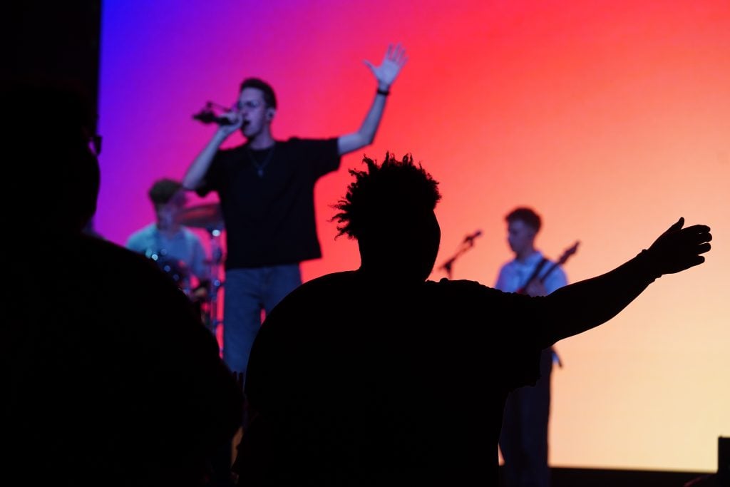 The Worship team performs during Monday’s musical worship Chapel at Global Credit Union Arena. April 6, 2026. -