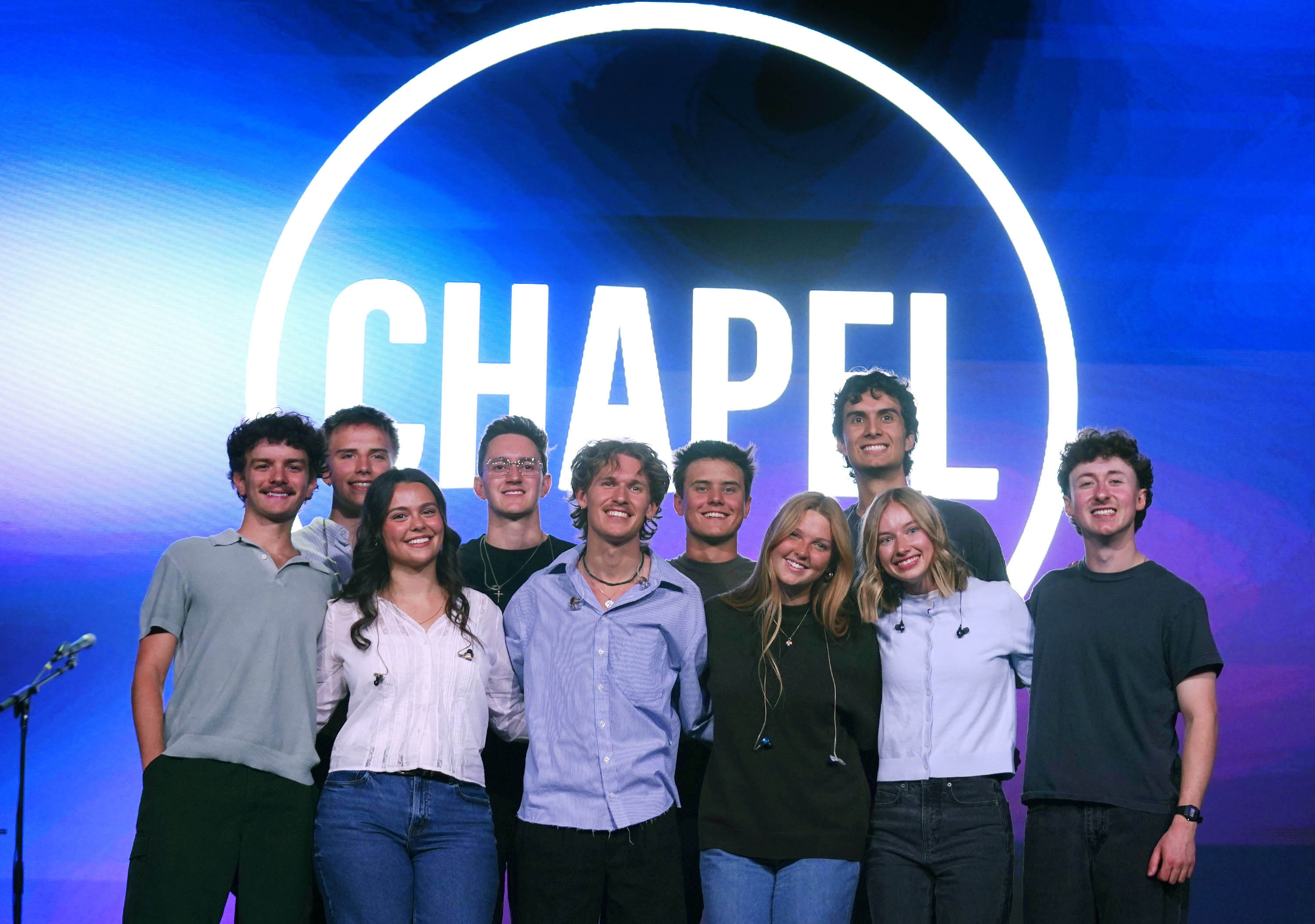The Worship team's seniors pose for a photo after their final performance following Monday’s musical worship Chapel at Global Credit Union Arena.