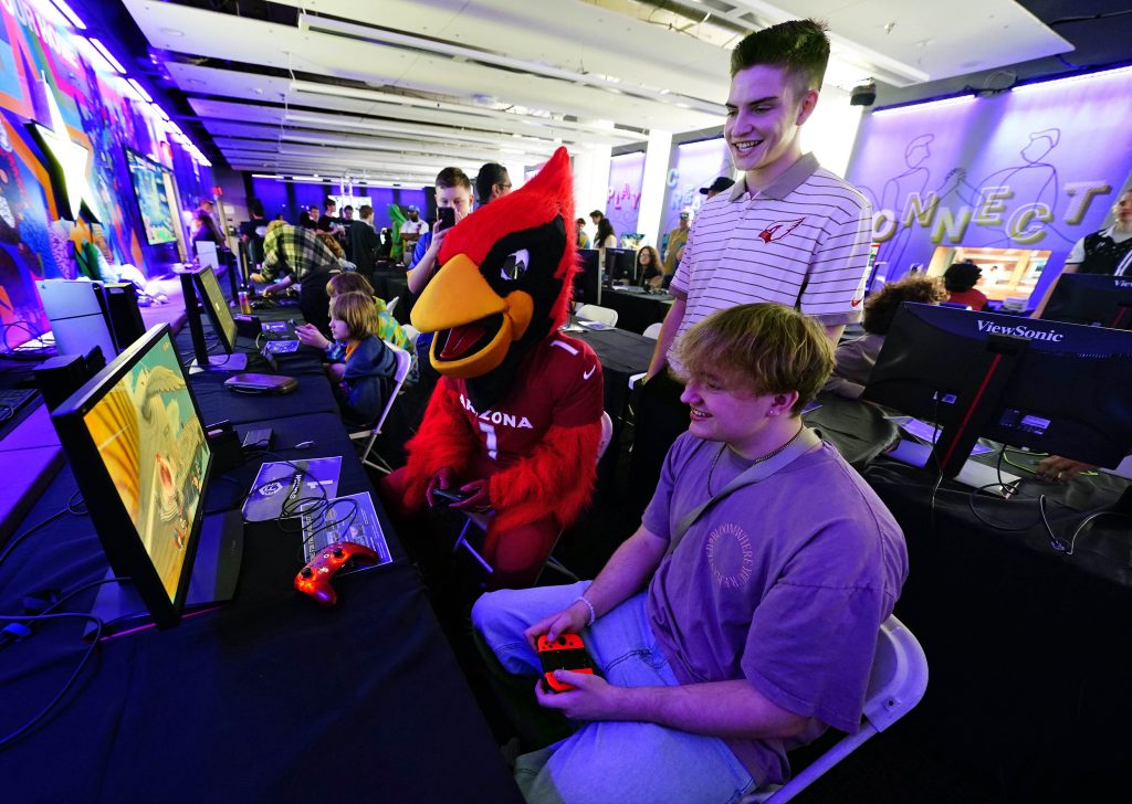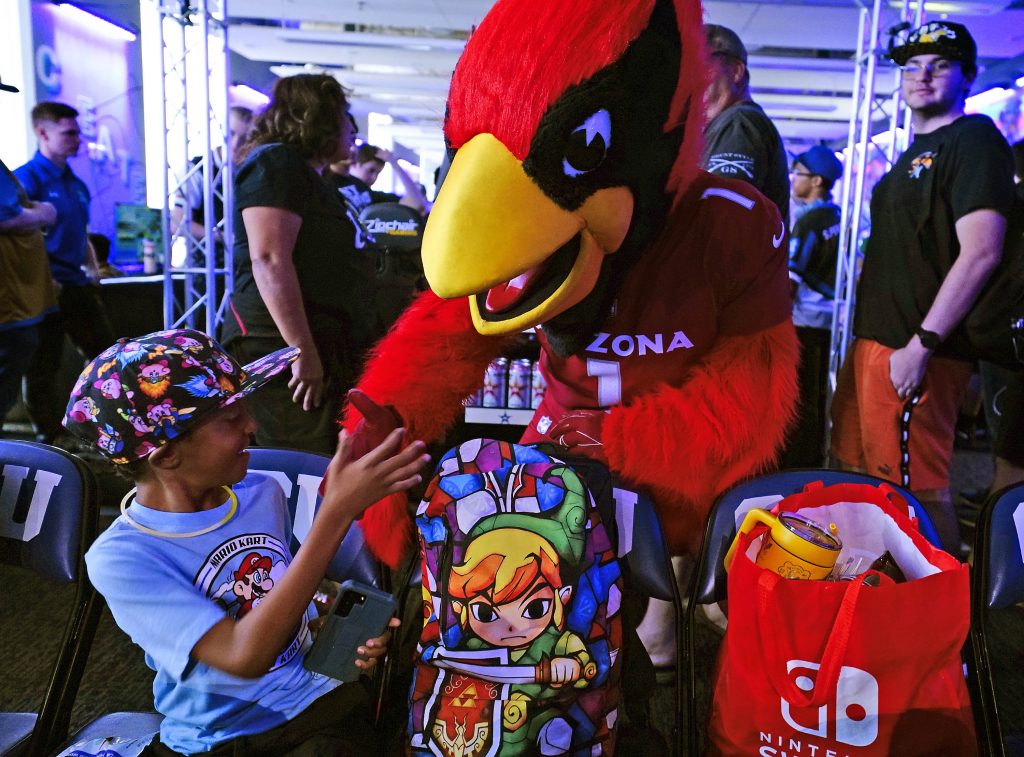 Arizona Cardinals mascot Big Red greeted young gamers during the Gaming for Arizona’s Children tournament at the GCU Esports Arena on Nov. 15, 2025. -