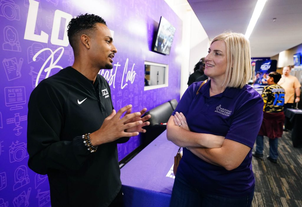 GCU Esports Director of Operations Jay DeShong talks with Arizona's Children Association CEO Tracy Thurston during the Gaming for Arizona’s Children tournament fundraiser. -