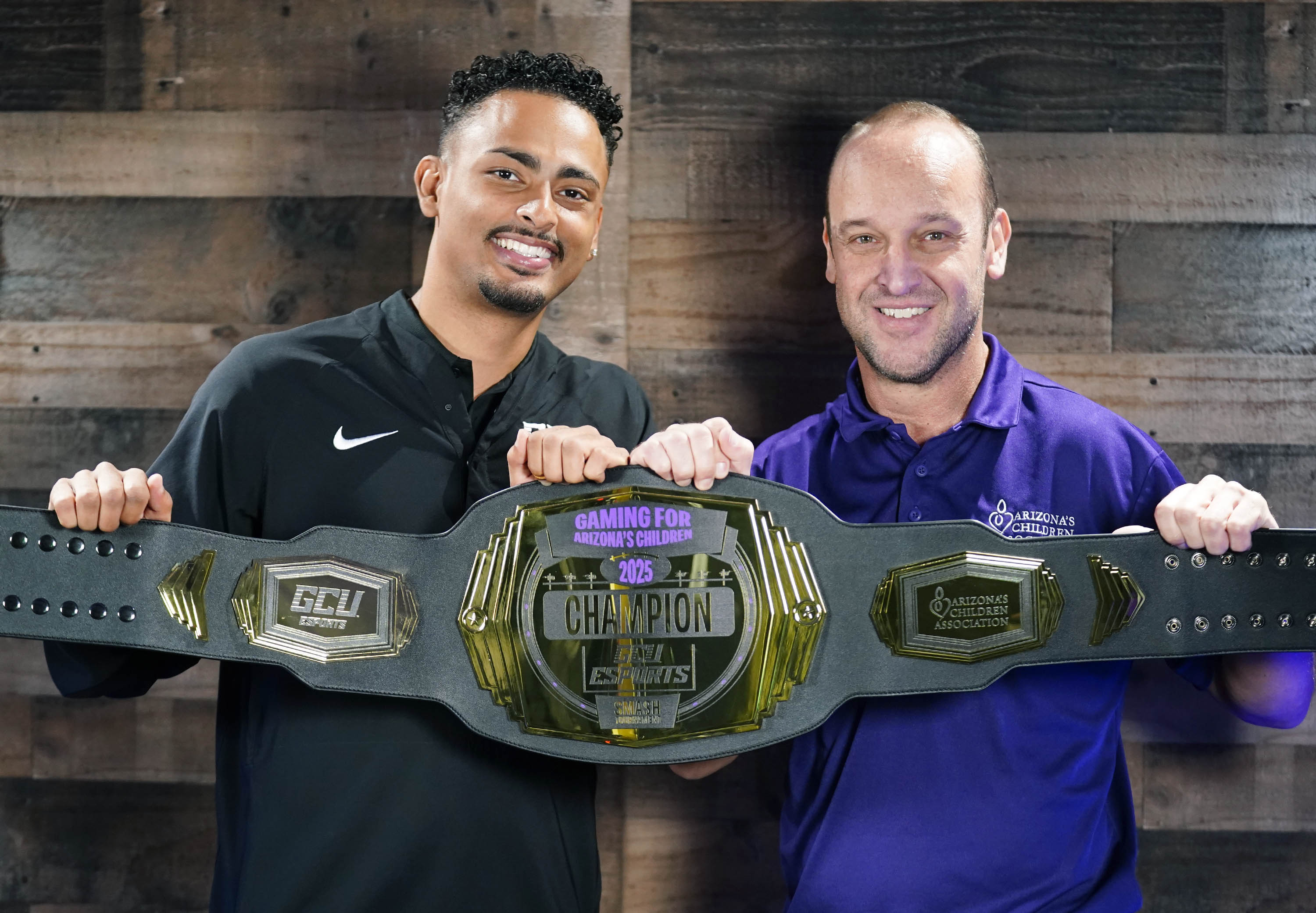 GCU Esports Director of Operations Jay DeShong (left) and Arizona's Children Association Senior Director of Development Jim Van Wicklin hold the champion's belt for the winner of the Gaming for Arizona’s Children tournament at the GCU Esports Arena and State Farm Stadium over the weekend. Nov. 15, 2025. -