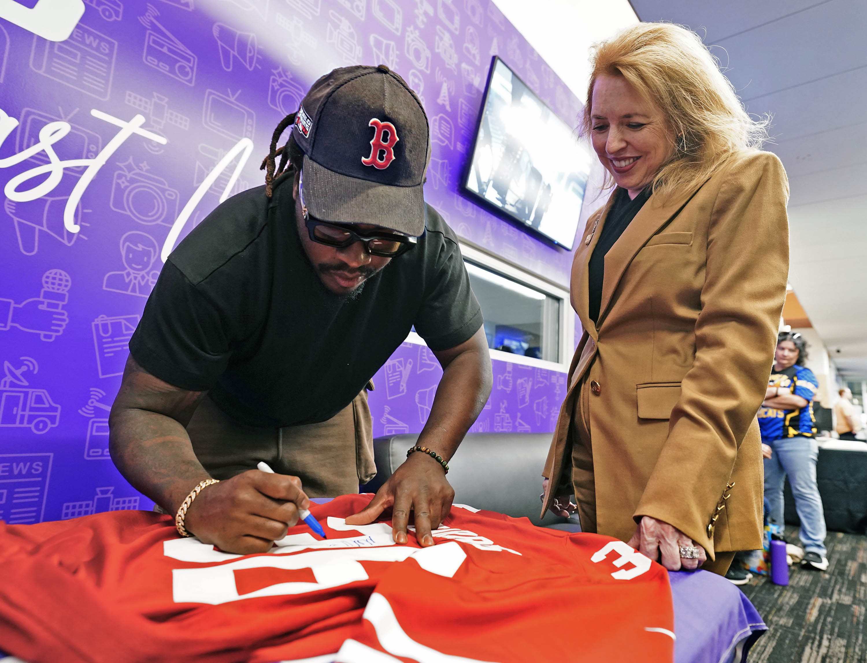 Former San Francisco 49ers linebacker Marcell Harris signs a jersey as Arizona's Children Association sponsor Pat Peyton looks on during the Gaming for Arizona’s Children tournament. -