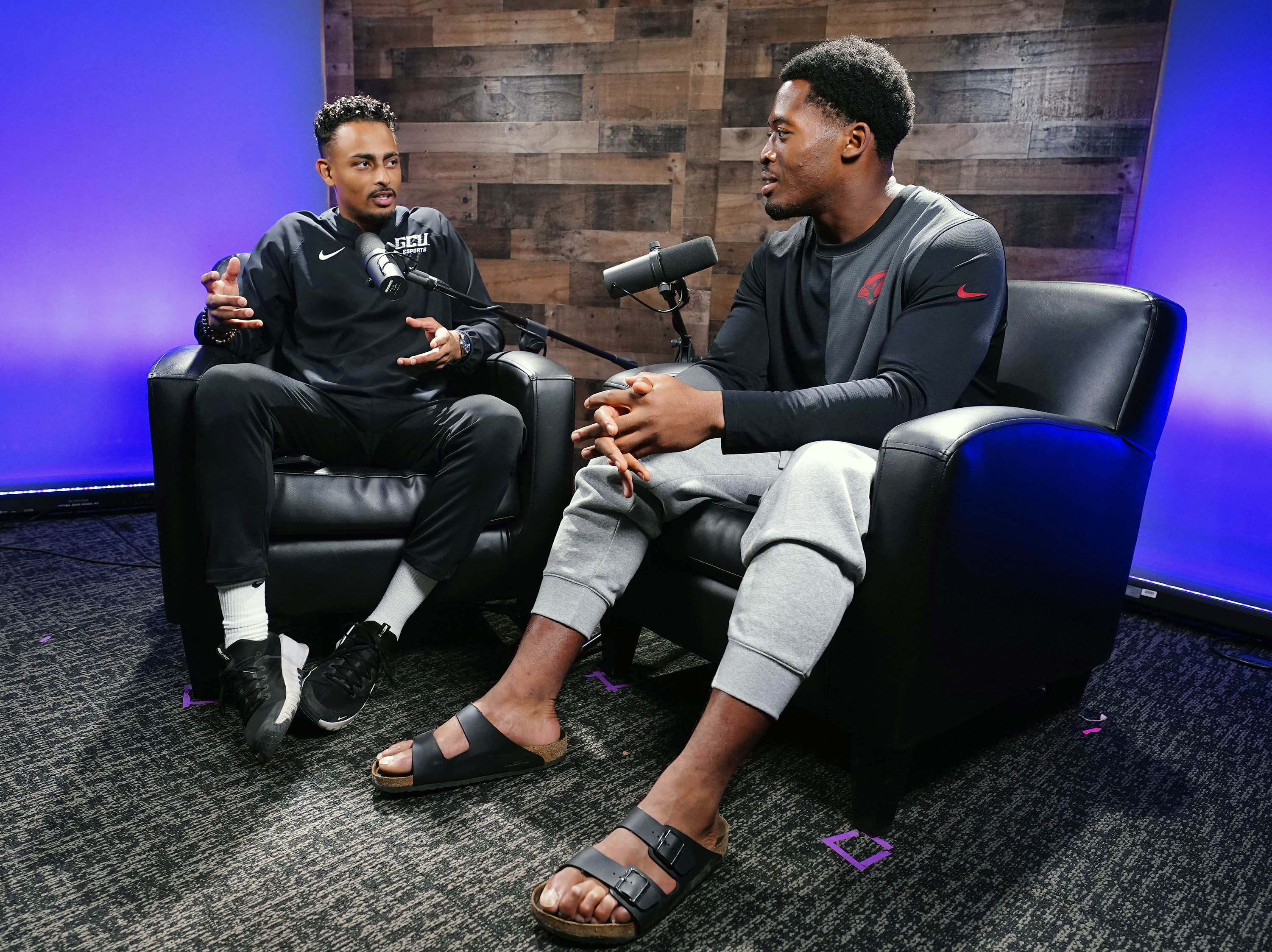 GCU Esports Director of Operations Jay DeShong interviews Cardinals linebacker Jared Bartlett during the livestream of the Gaming for Arizona’s Children tournament fundraiser. -