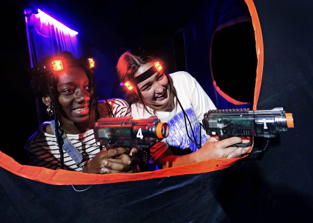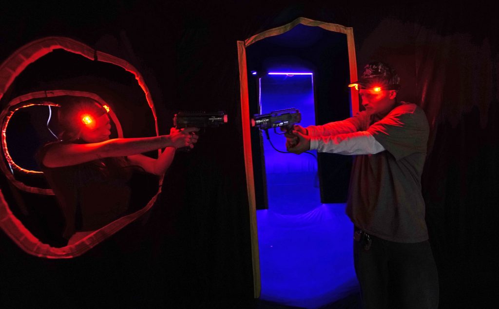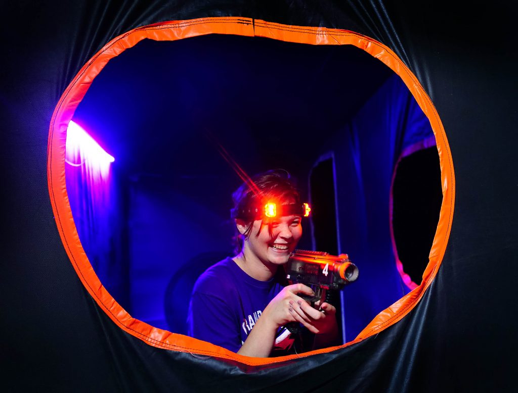 Bustin’ Makes Me Feel Good … A student takes aim at an opposing team member through an opening in the maze-like inflatable course during the Canyon Activities Board-sponsored Ghostbusters Laser Tag at Antelope Gymnasium on Oct. 22, 2025. -