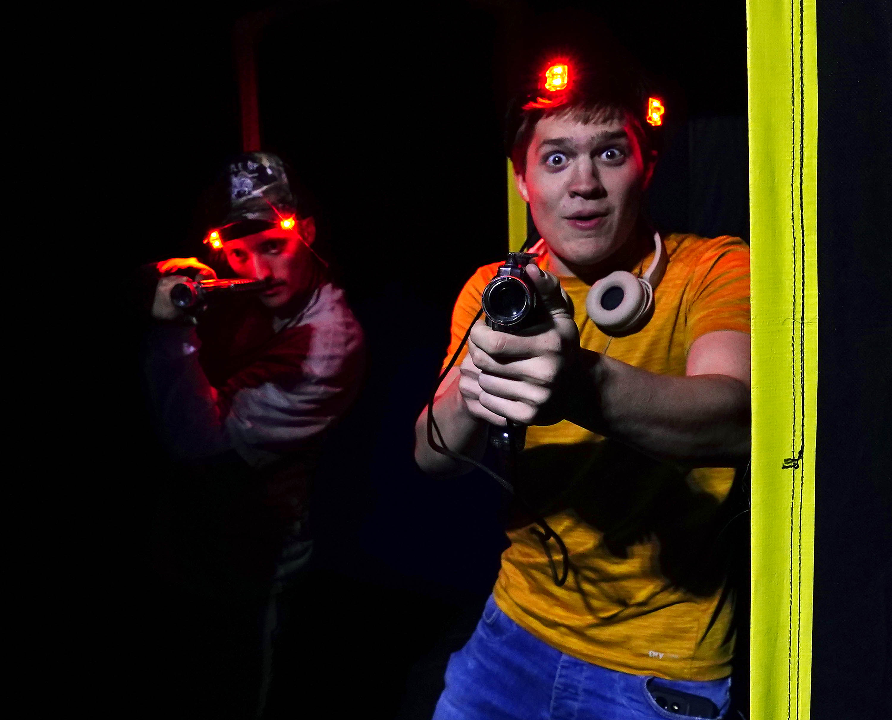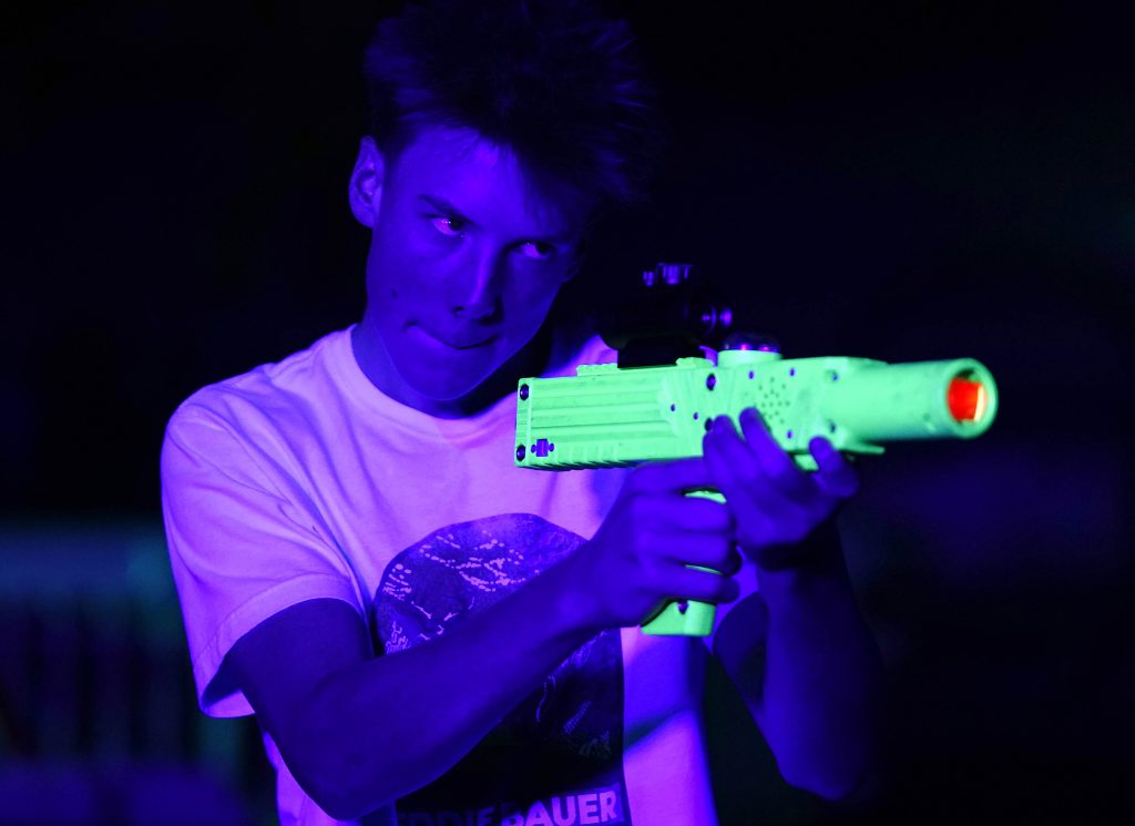A student fires his laser at an opposing team member during the Canyon Activities Board-sponsored Ghostbusters Laser Tag at Antelope Gymnasium on Oct. 22, 2025. -