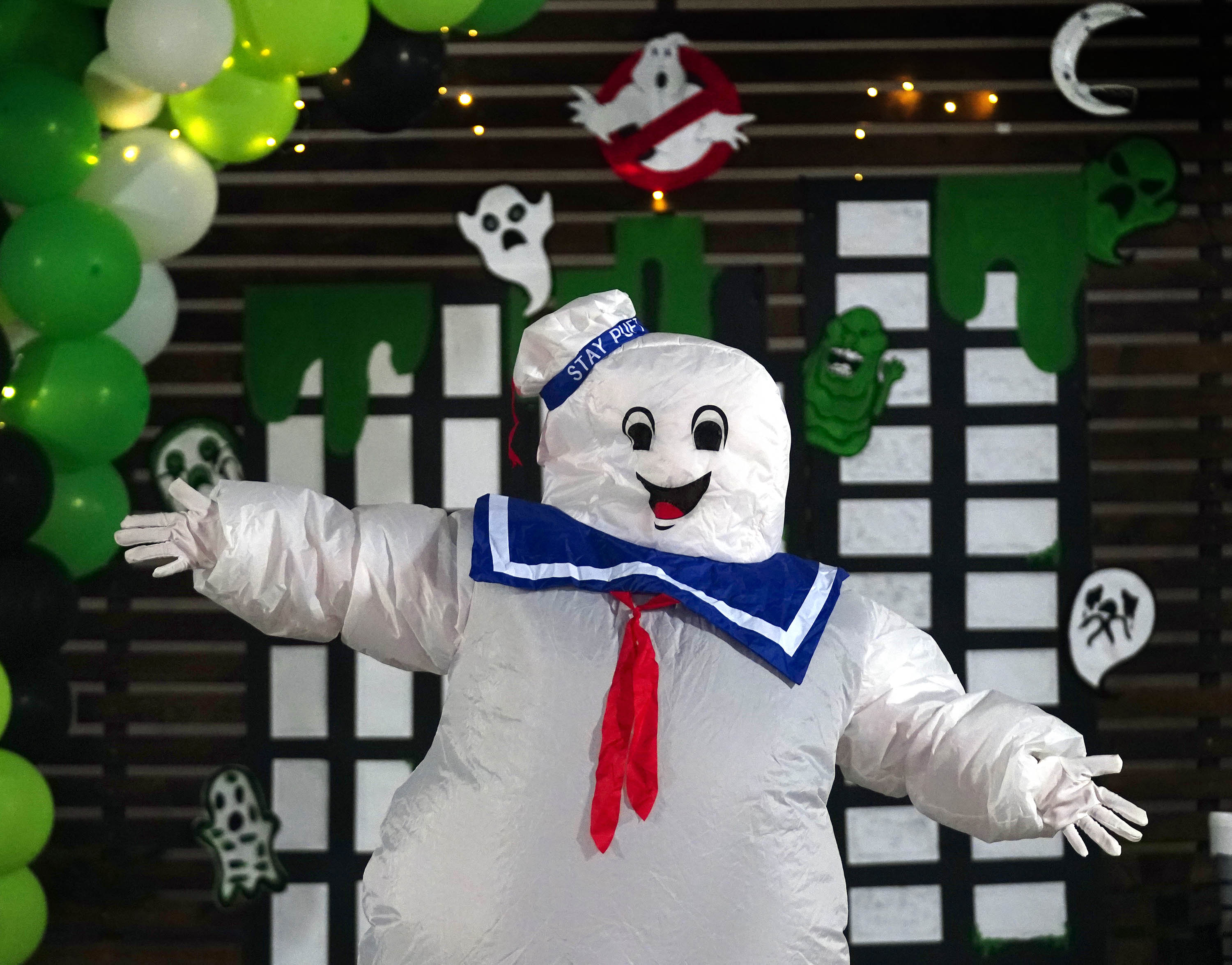 The Stay-Puft Marshmallow Man makes an appearance at the photo booth during the Canyon Activities Board-sponsored Ghostbusters Laser Tag at Antelope Gymnasium on Oct. 22, 2025. -