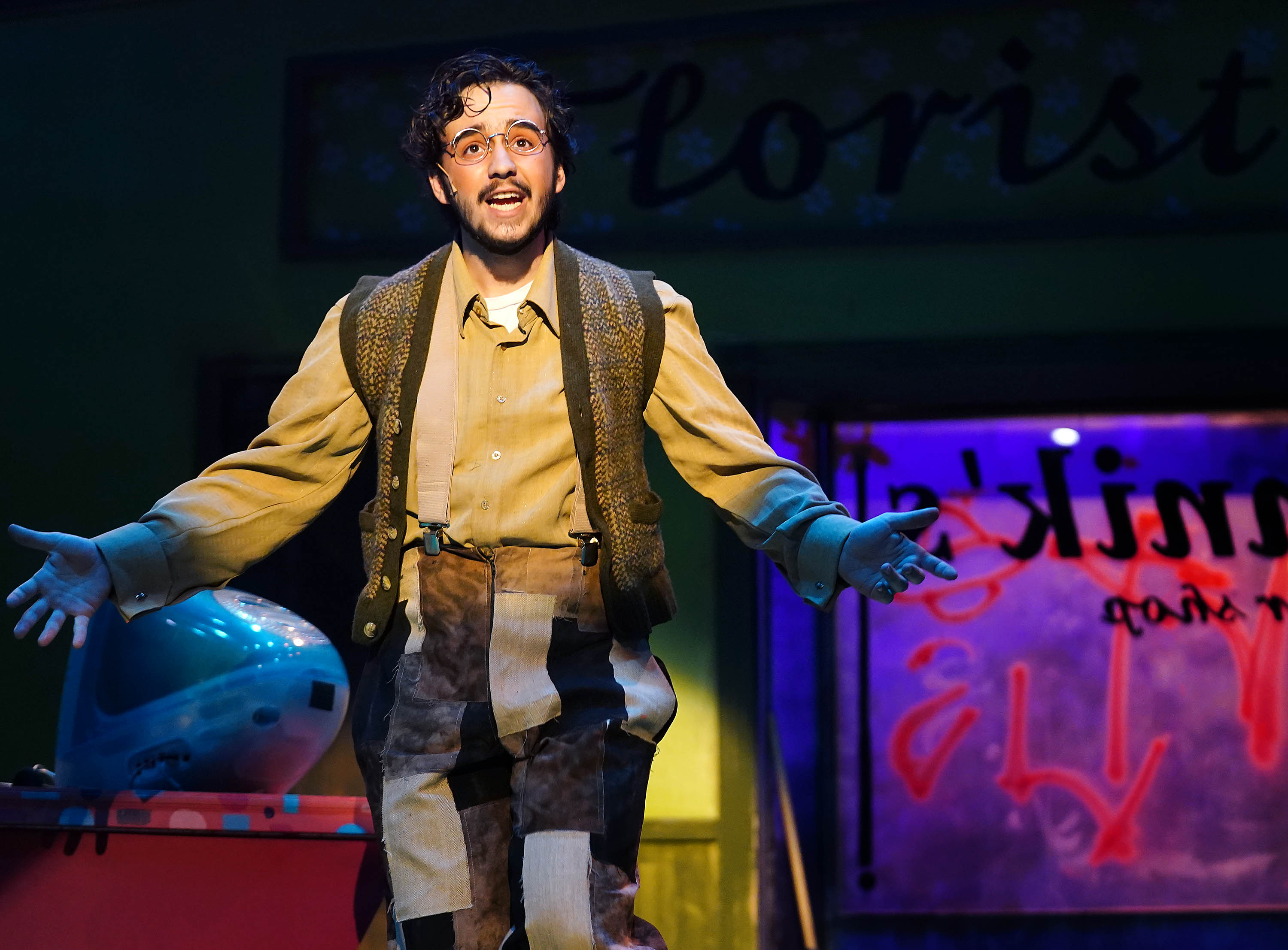 Flower shop owner Mr. Mushnik (Caleb Moran) during a dress rehearsal for the theatre department’s production of “Little Shop of Horrors” at Ethington Theatre on Nov. 5, 2025. -