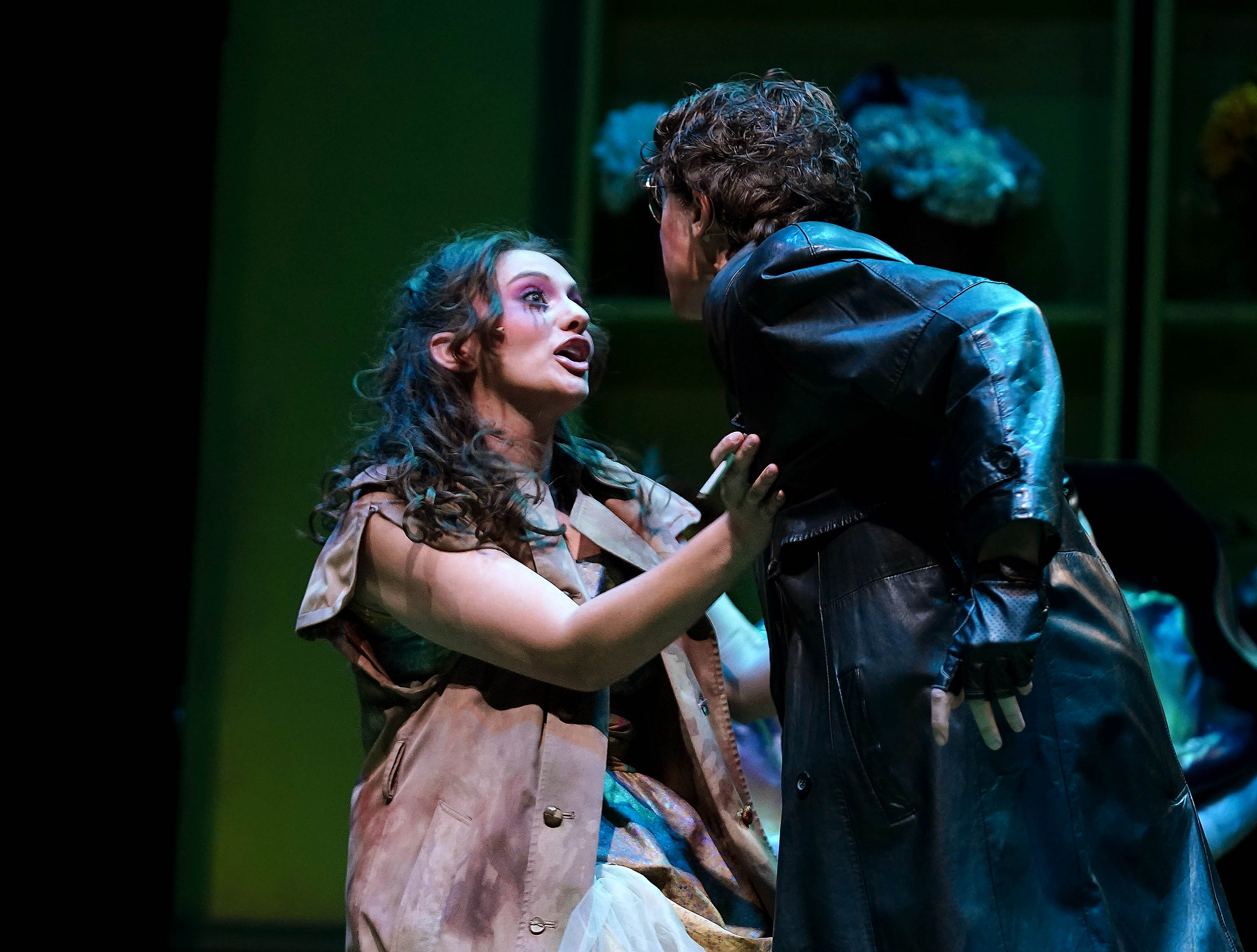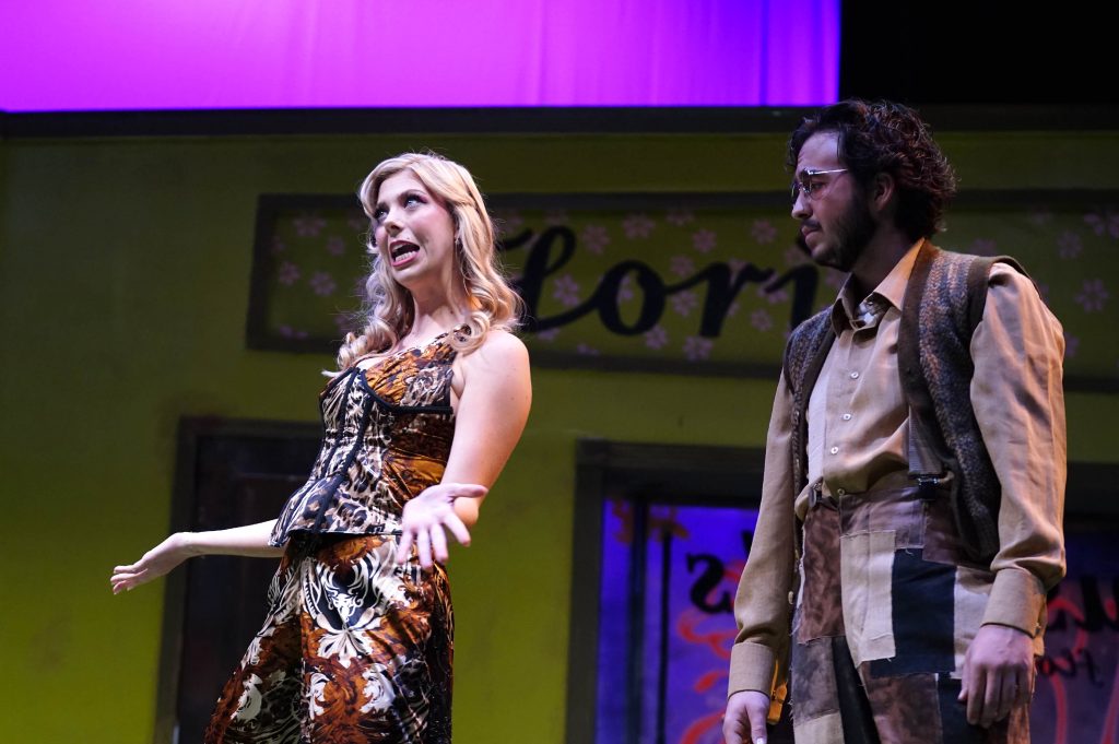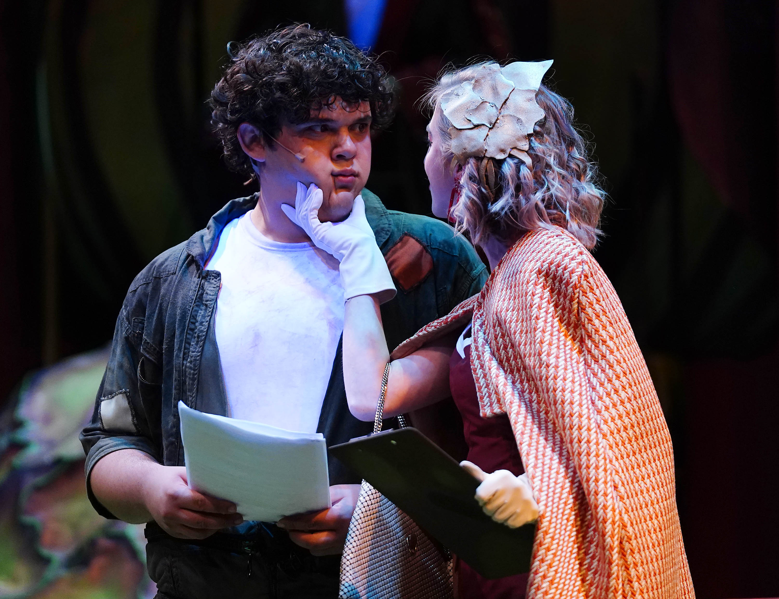 Audrey (Adeline O’Reilly) and Seymour (Erick Resendiz) during a dress rehearsal for the theatre department’s production of “Little Shop of Horrors” at Ethington Theatre on Nov. 5, 2025. -