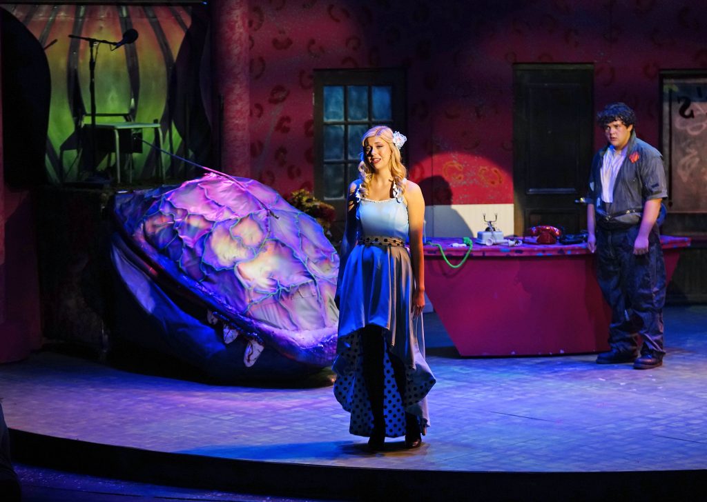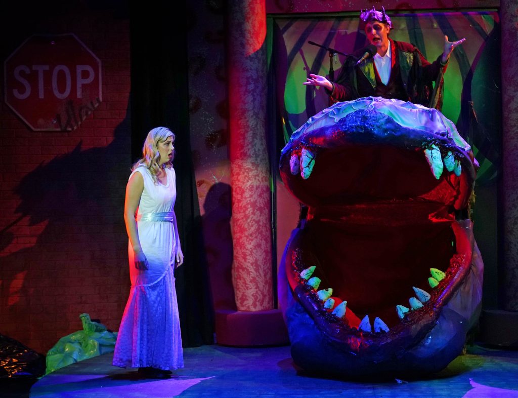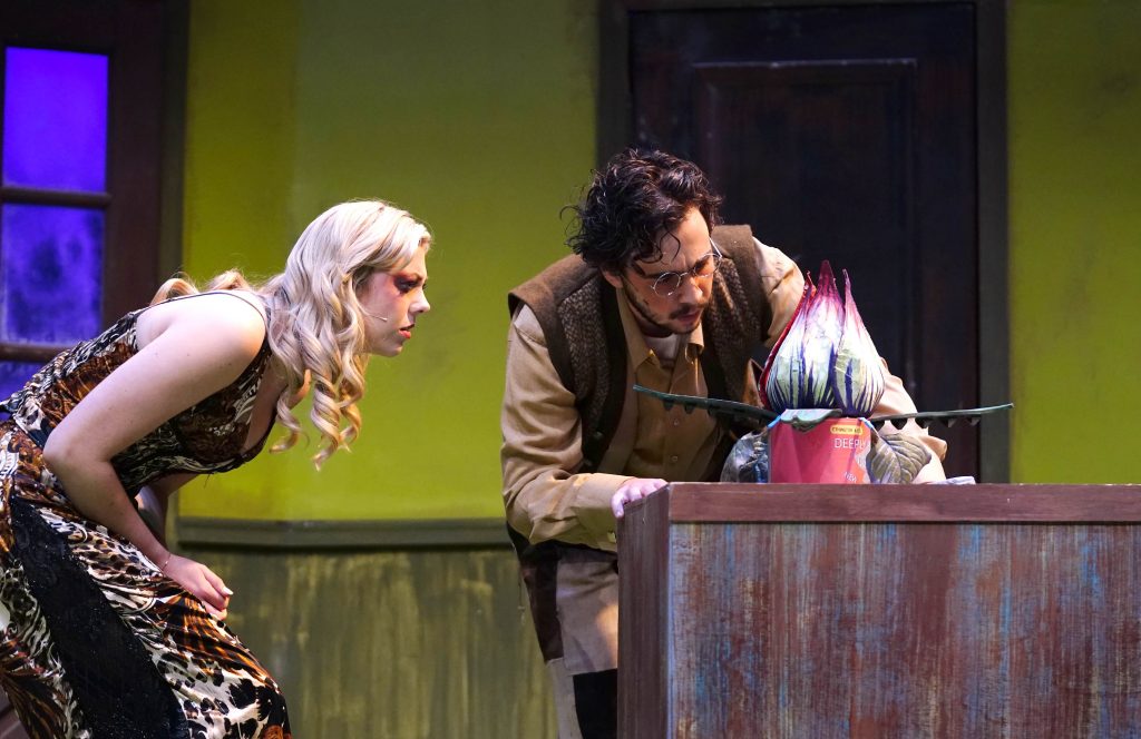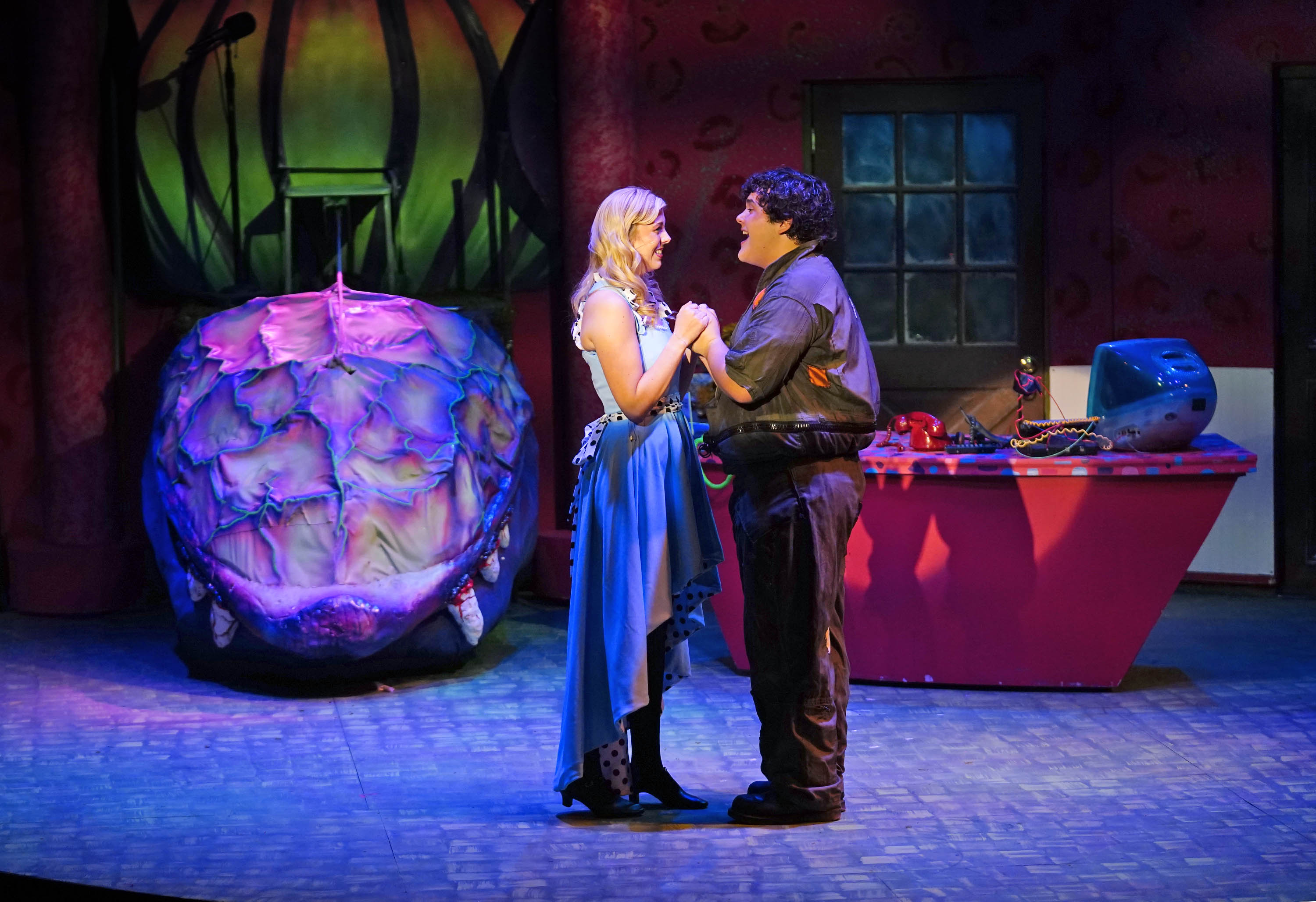 Audrey (Adeline O’Reilly) discovers the talking Audrey II (Ben Sparling) during a dress rehearsal for the theatre department’s production of “Little Shop of Horrors” at Ethington Theatre on Nov. 5, 2025. -