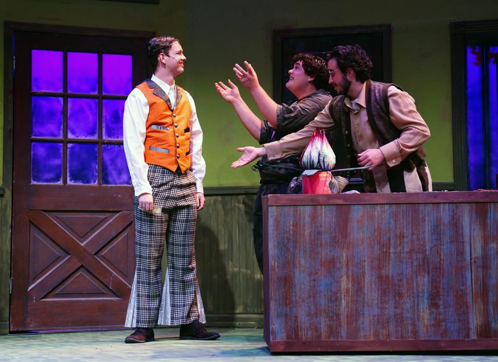 Seymour (Erick Resendiz) and Mr. Mushnik (Caleb Moran) welcome in a paying customer (Hudson Hobbs) during a rehearsal for the theatre department’s production of “Little Shop of Horrors” at Ethington Theatre on Nov. 5, 2025. -