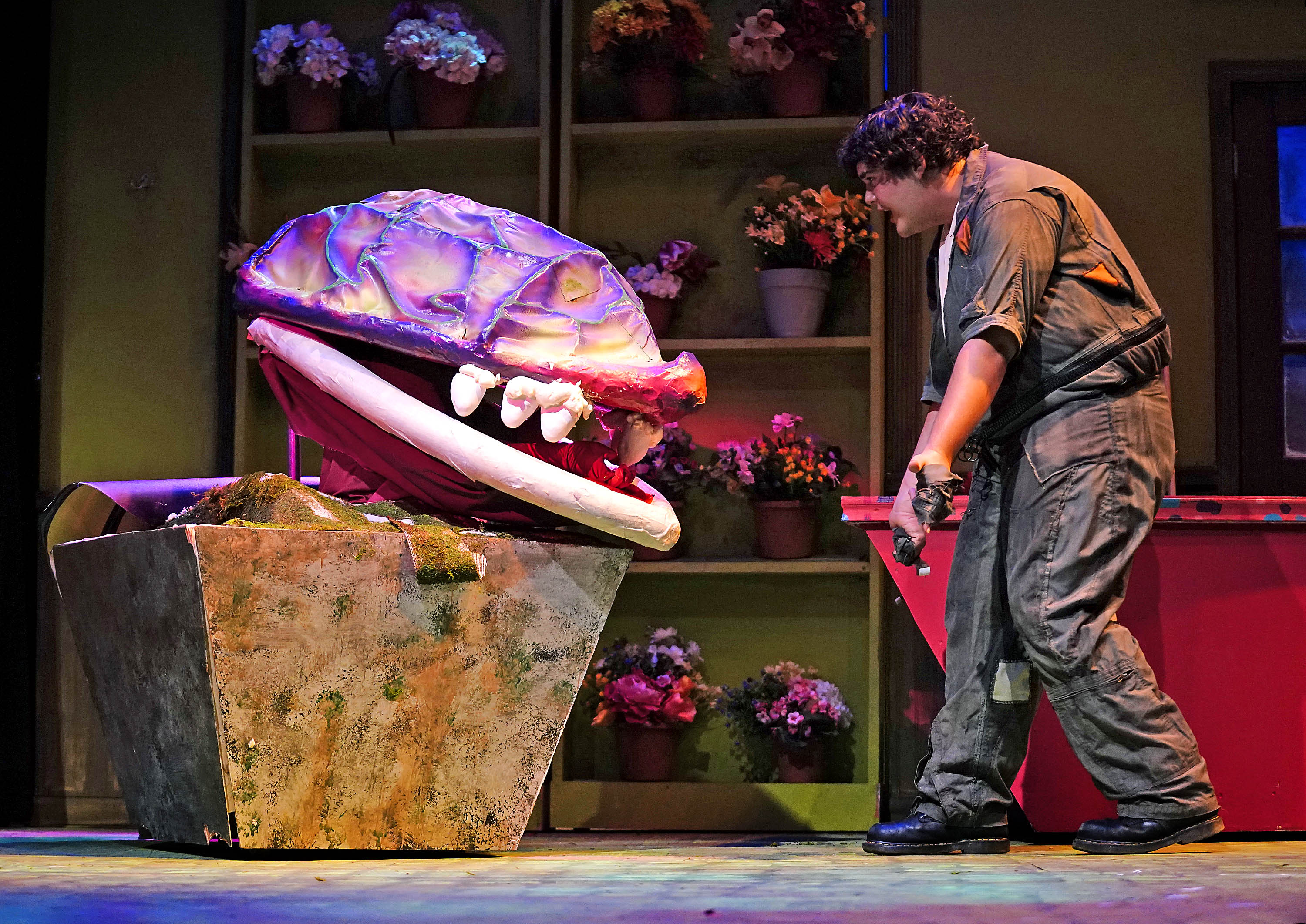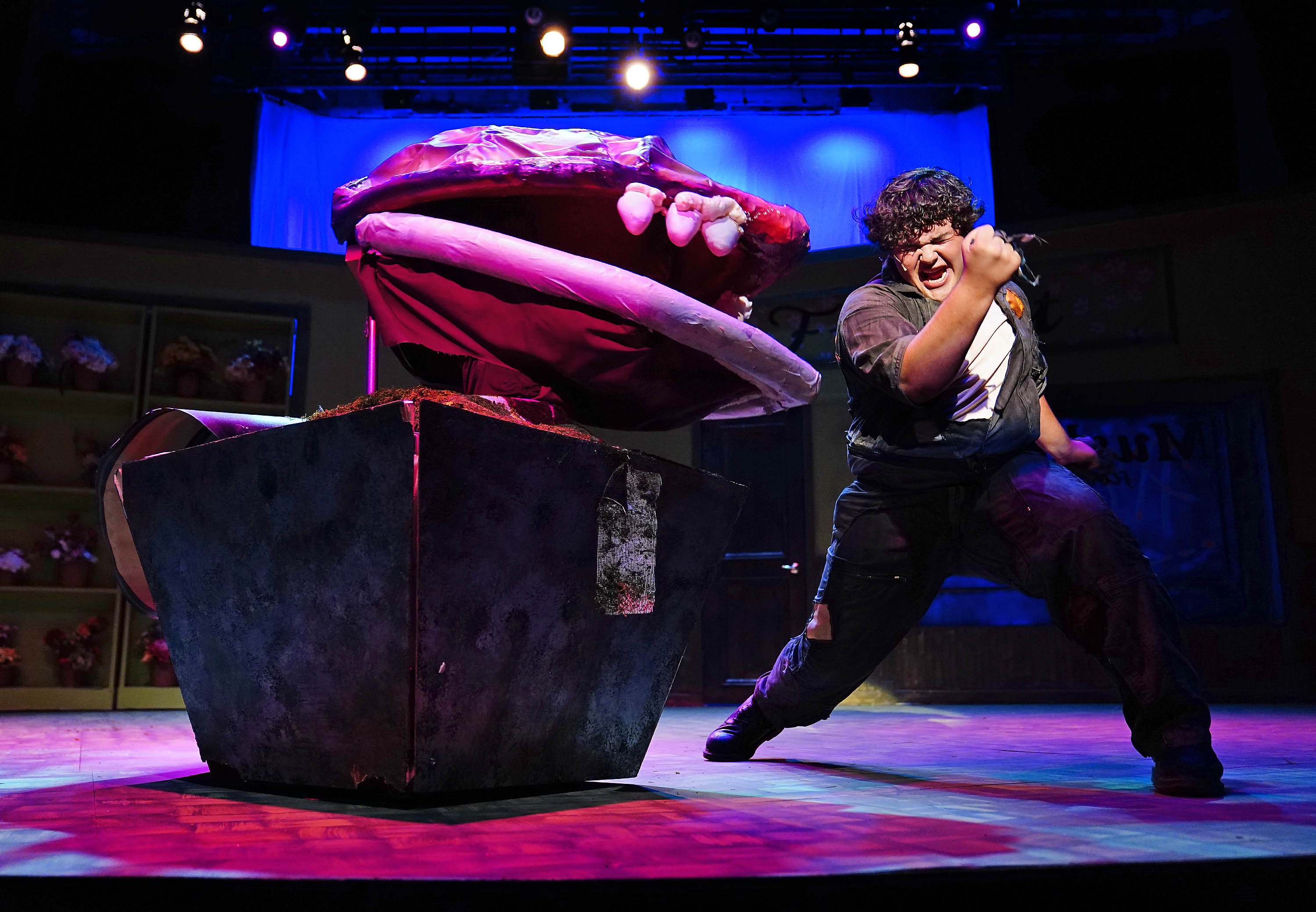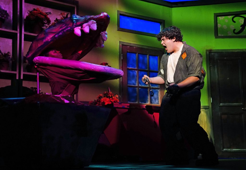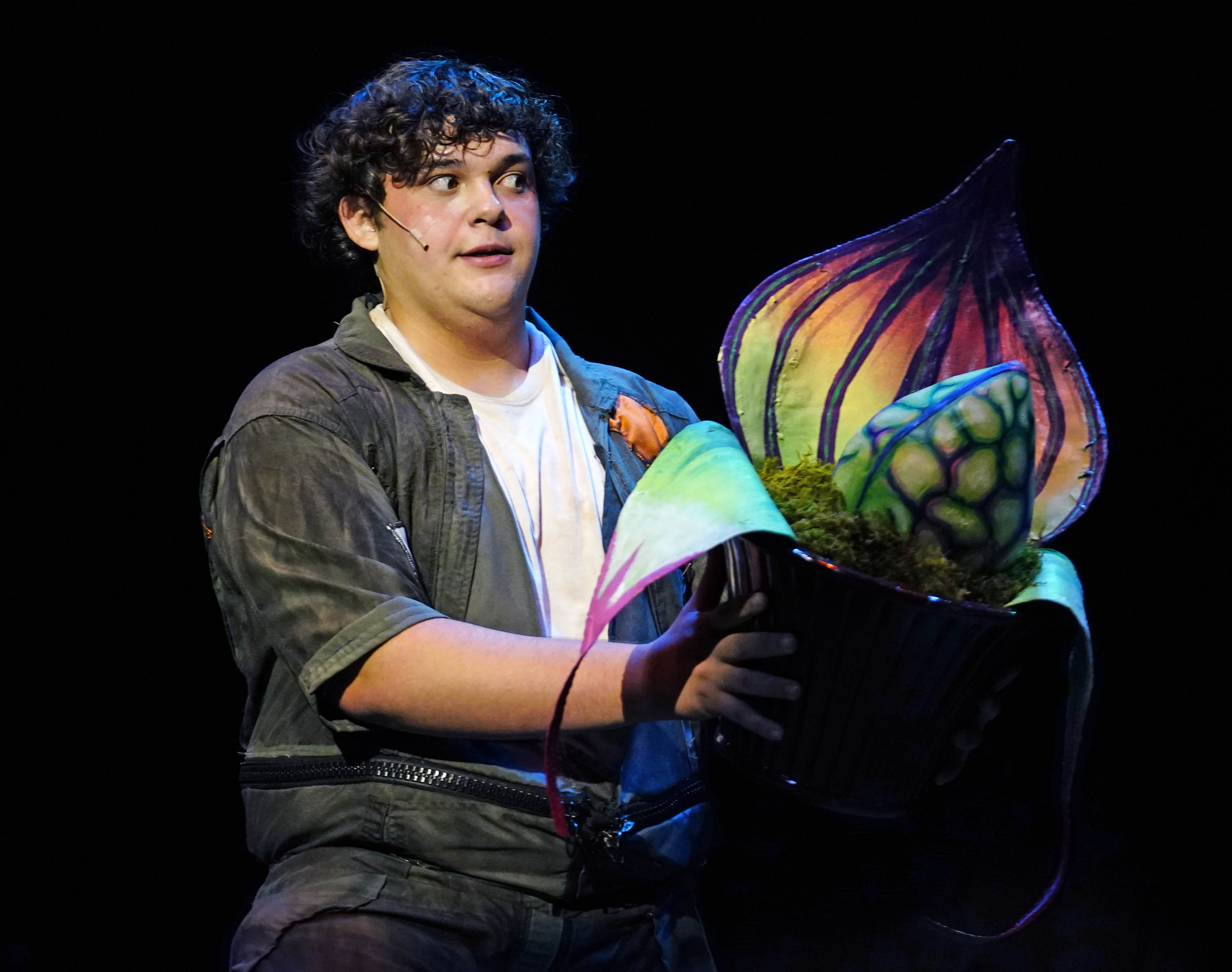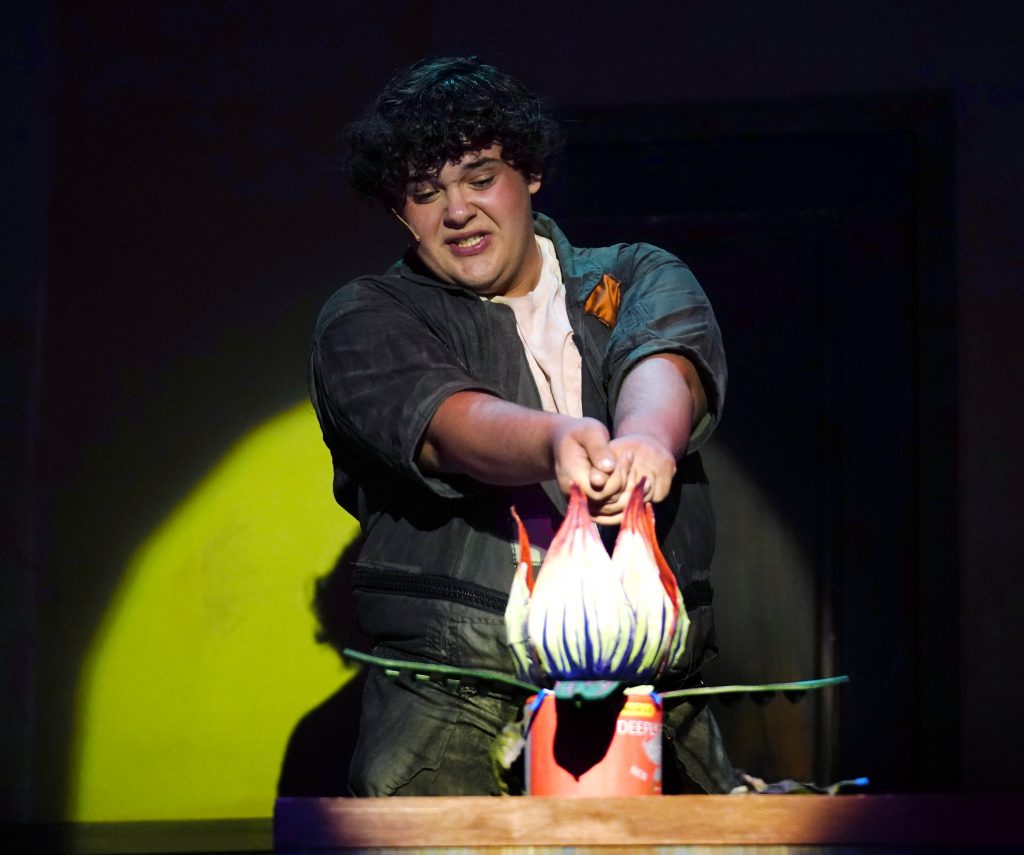 Seymour (Erick Resendiz) is surprised at how quickly Audrey II is growing during a dress rehearsal for the theatre department’s production of “Little Shop of Horrors” at Ethington Theatre on Nov. 5, 2025. -
