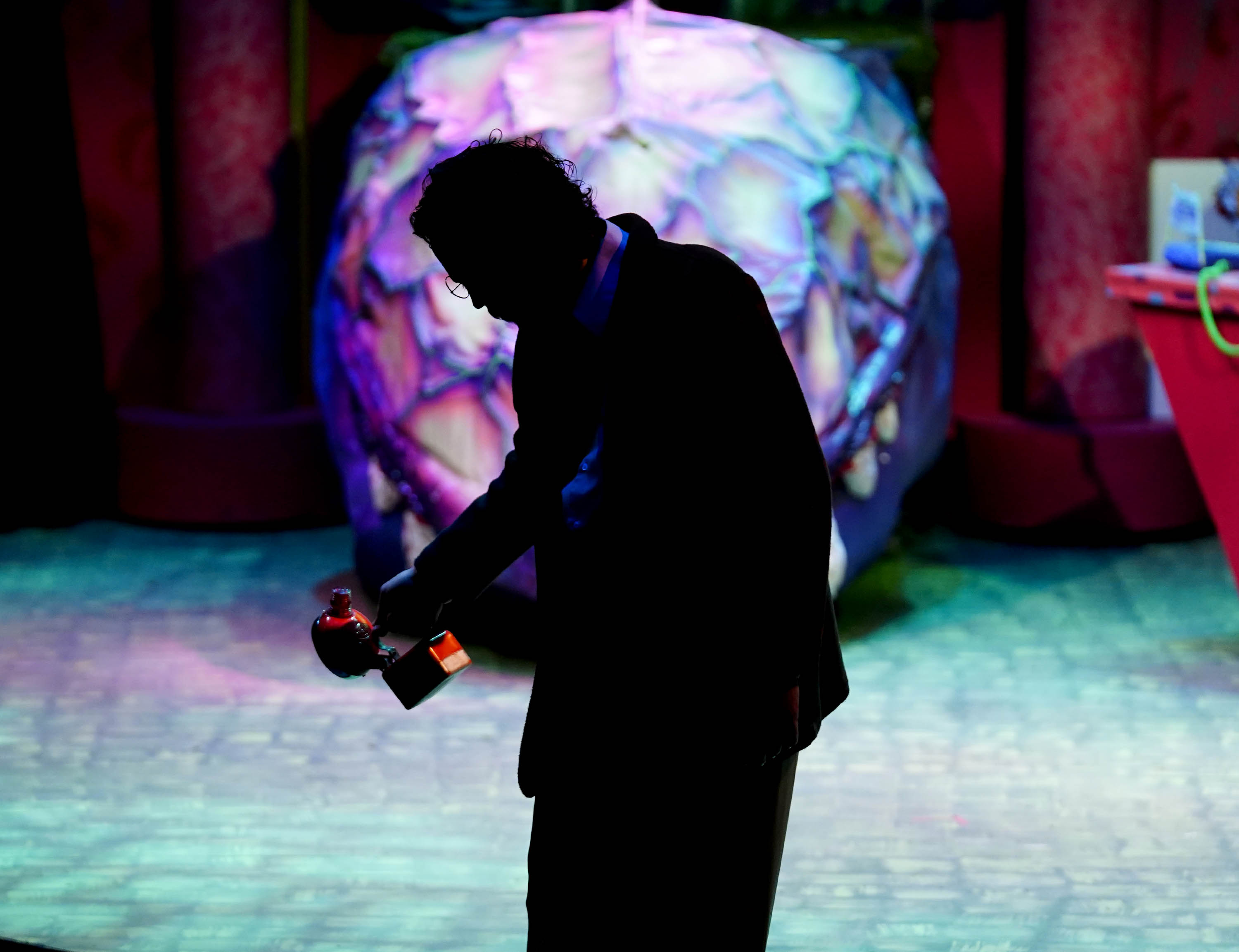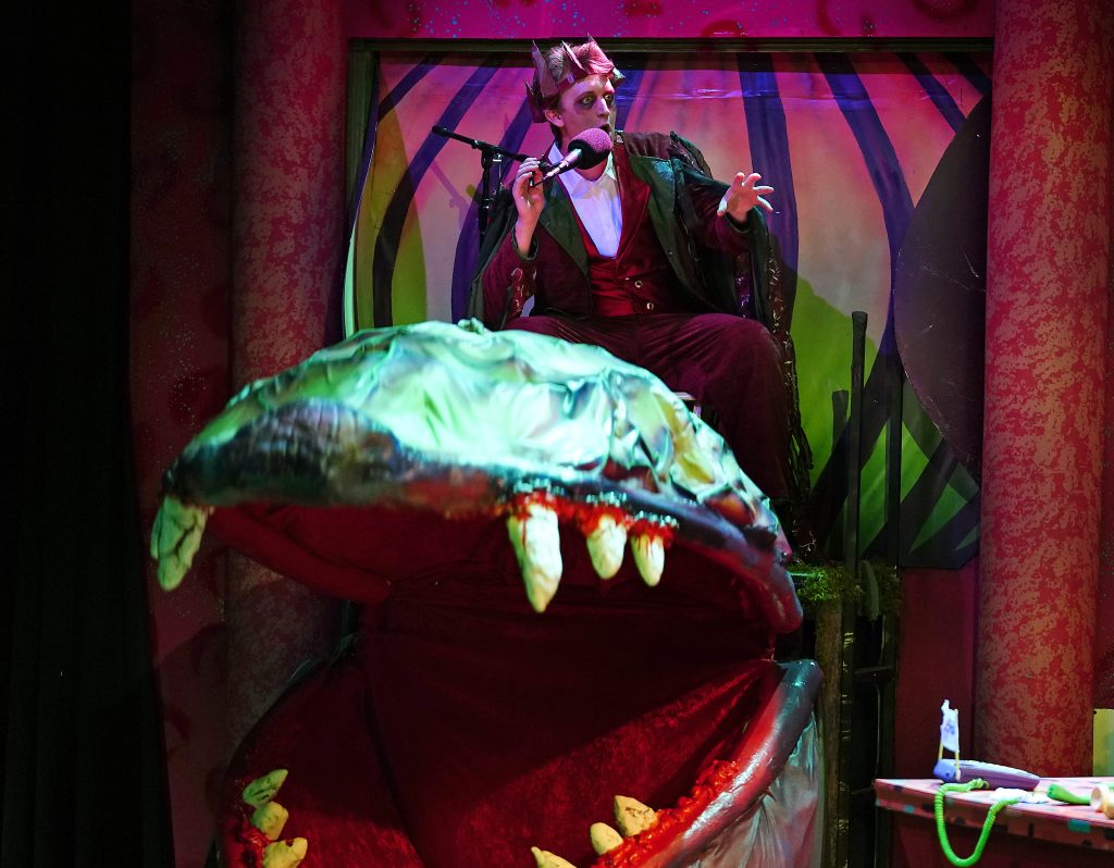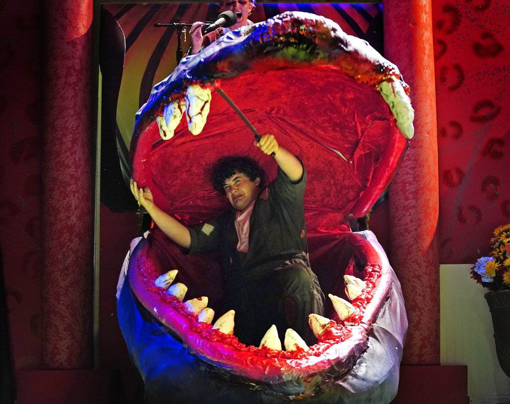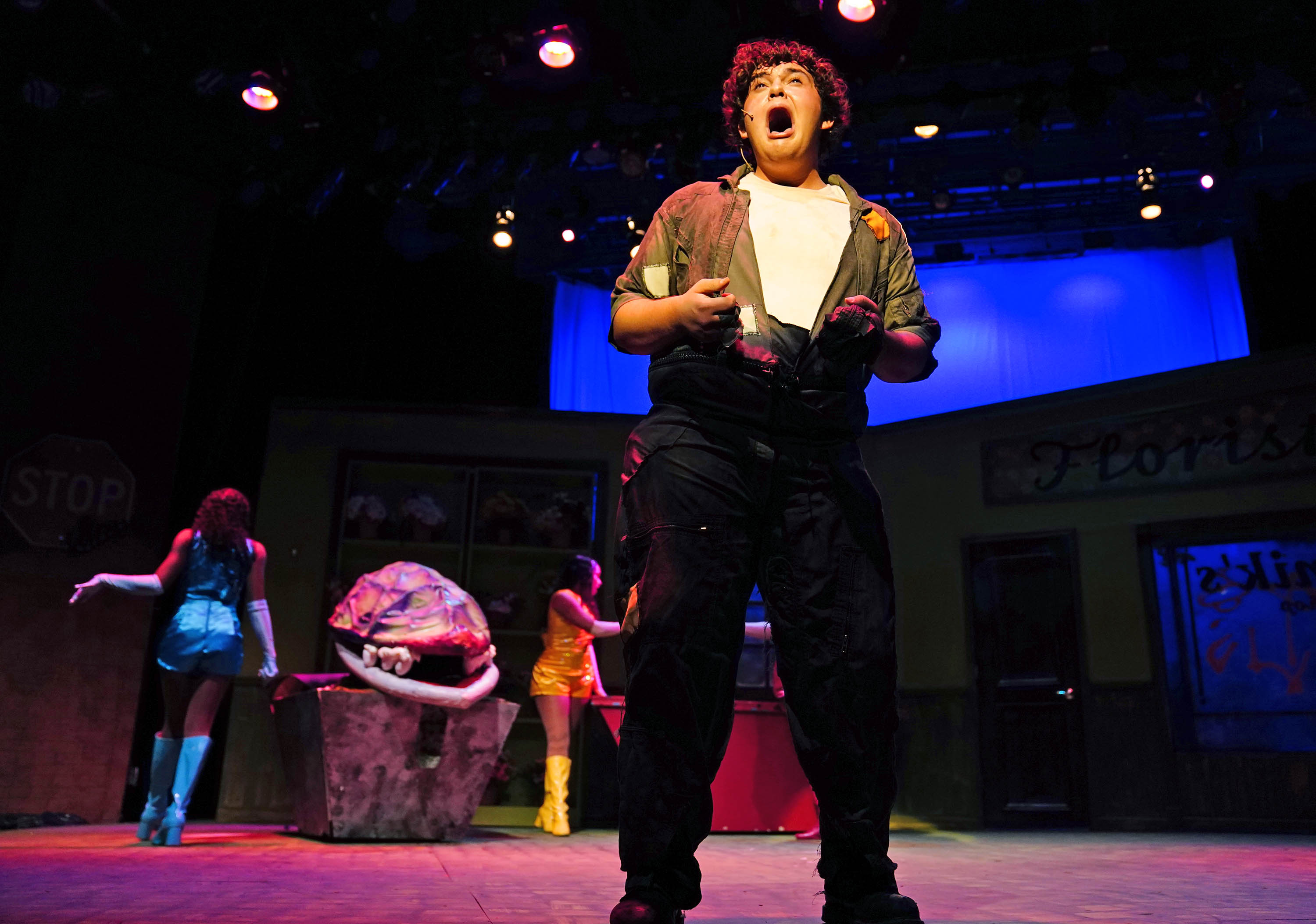 Seymour (Erick Resendiz) is surprised at how quickly Audrey II is growing during a dress rehearsal for the theatre department’s production of “Little Shop of Horrors” at Ethington Theatre on Nov. 5, 2025. -