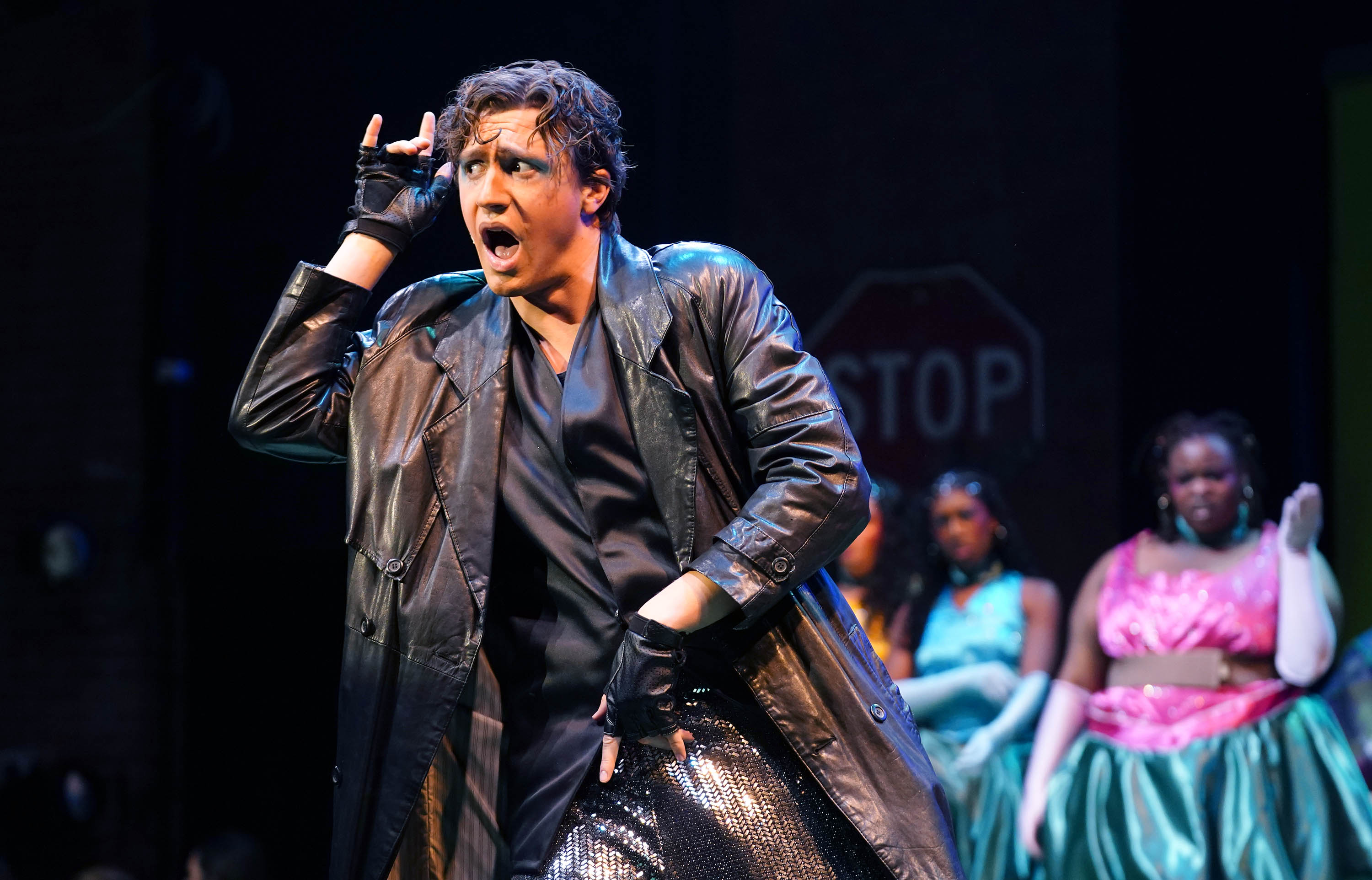 Orin (Carter Giannetti) is roughed up by the Ronnettes during a dress rehearsal for the theatre department’s production of “Little Shop of Horrors” at Ethington Theatre on Nov. 5, 2025. -
