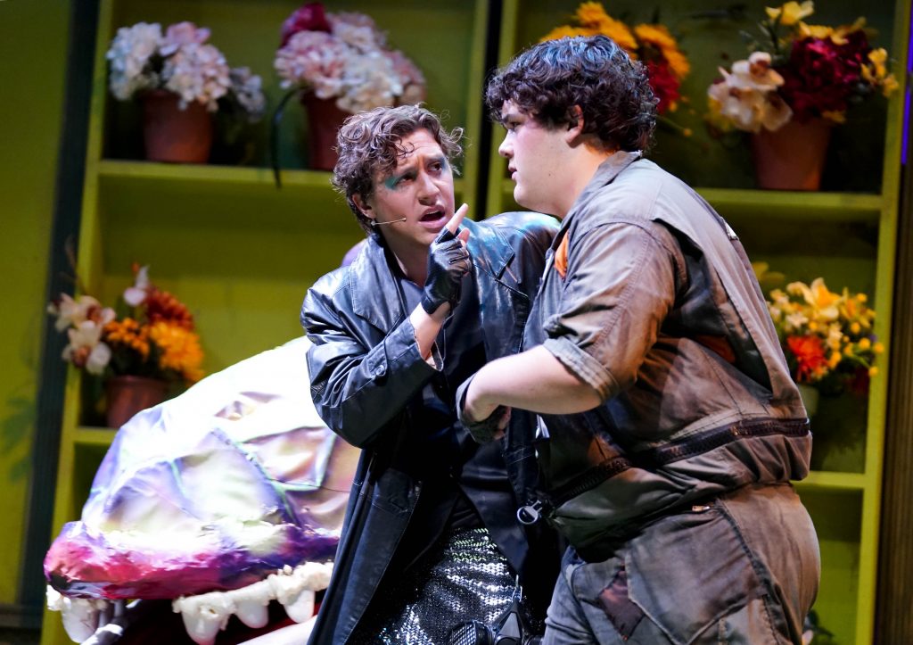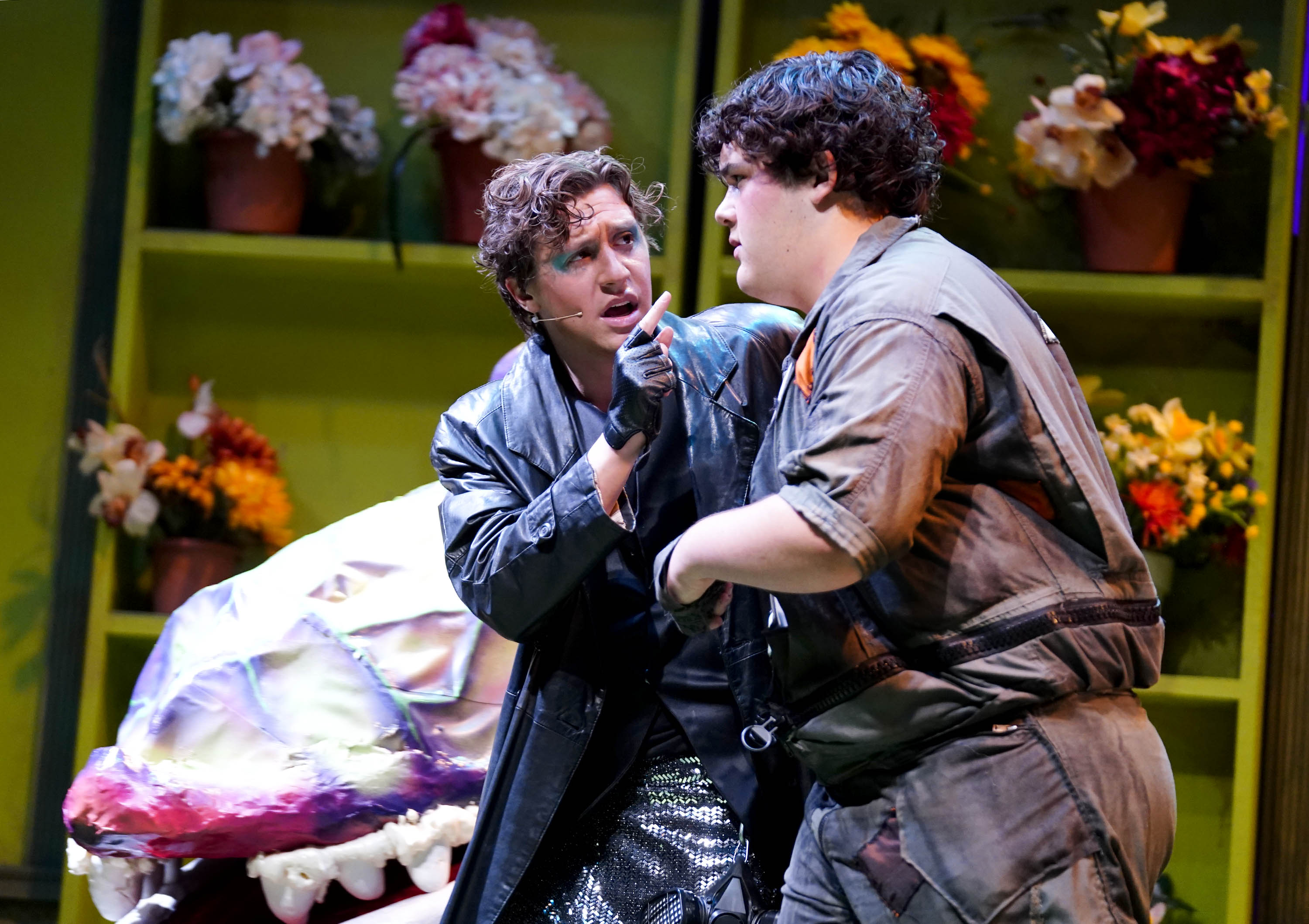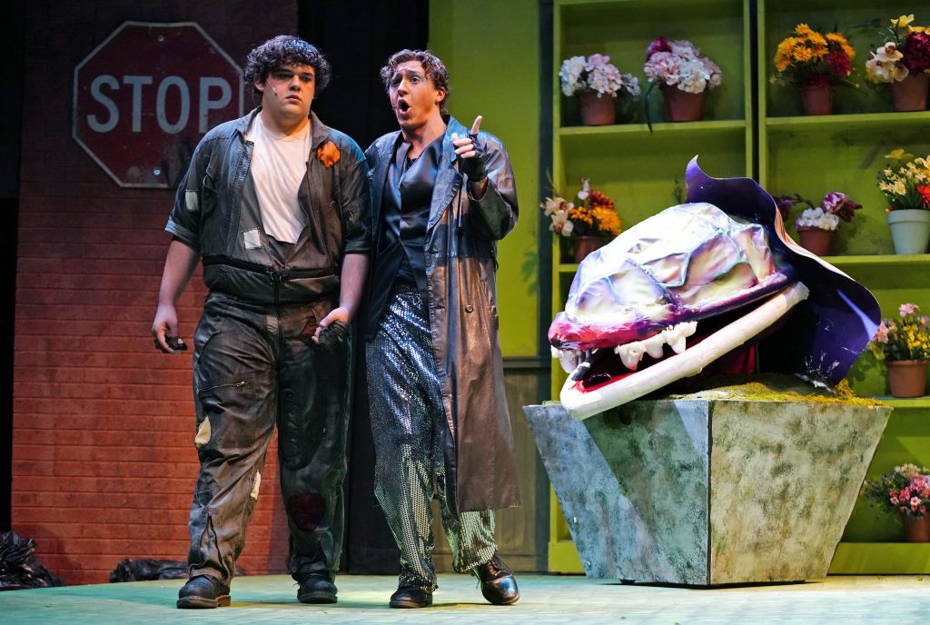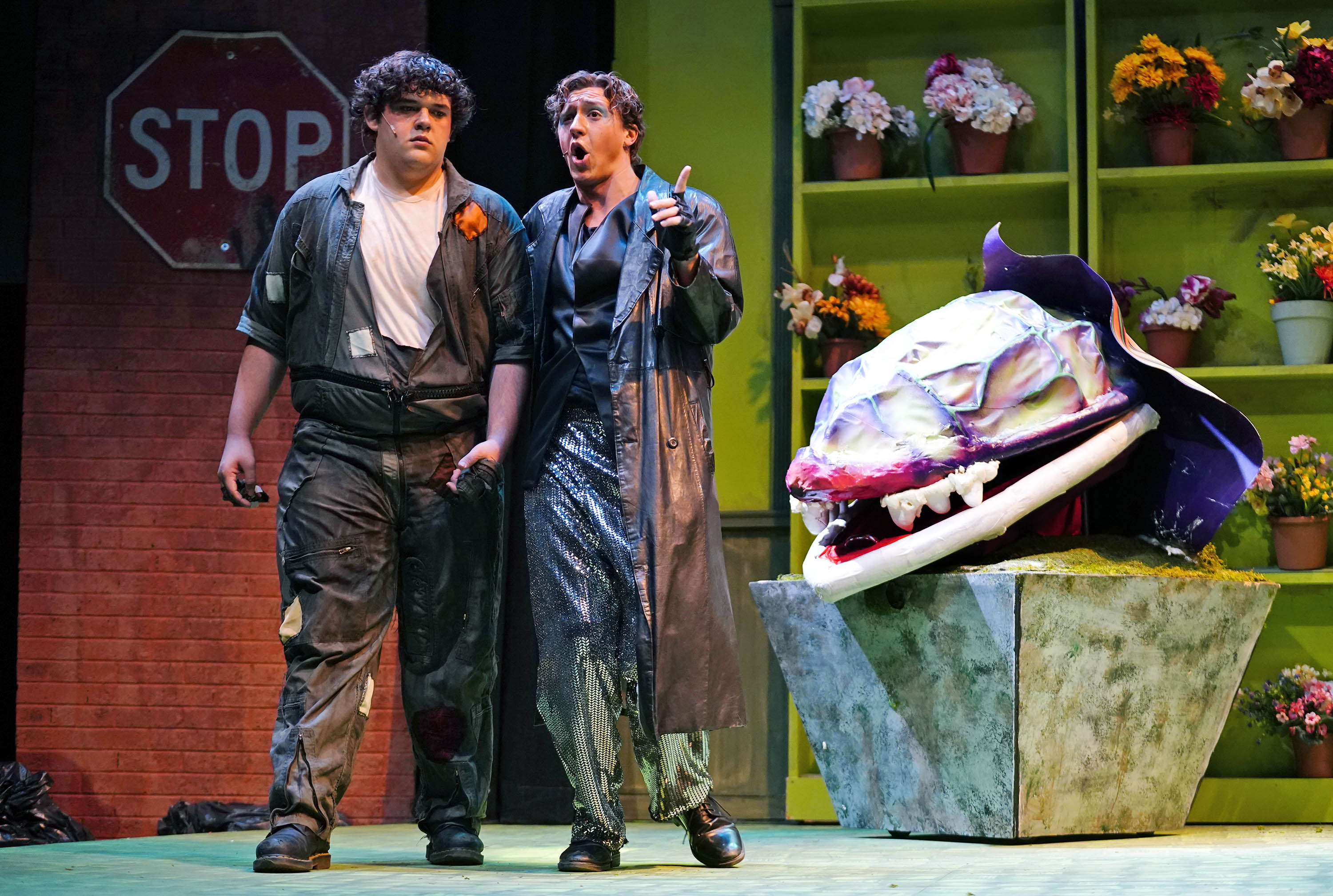 A full-grown Audrey II (Ben Sparling) and Seymour (Erick Resendiz) during a dress rehearsal for the theatre department’s production of “Little Shop of Horrors” at Ethington Theatre on Nov. 5, 2025. -