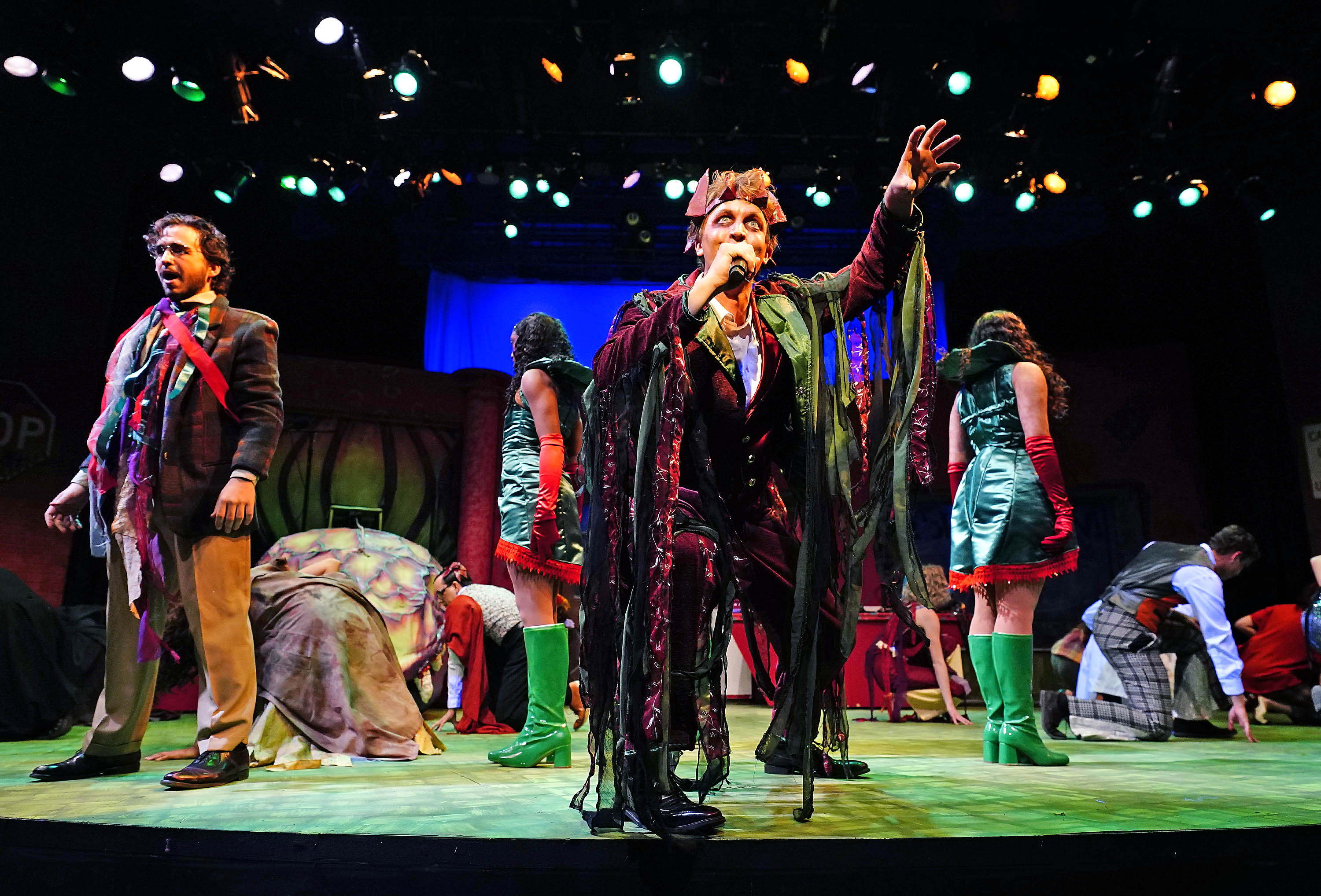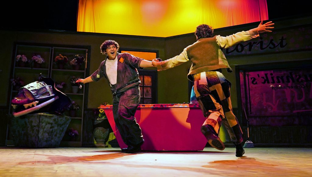 Seymour (Erick Resendiz) celebrates a plan with Audrey II during a dress rehearsal for the theatre department’s production of “Little Shop of Horrors” at Ethington Theatre on Nov. 5, 2025. -