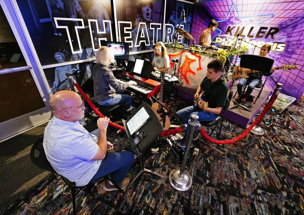 Mark Fearey directs the live five-piece band, the Killer Psychopsis, in the lobby of Ethington Theatre during a dress rehearsal for the theatre department’s production of “Little Shop of Horrors” on Nov. 5, 2025. -
