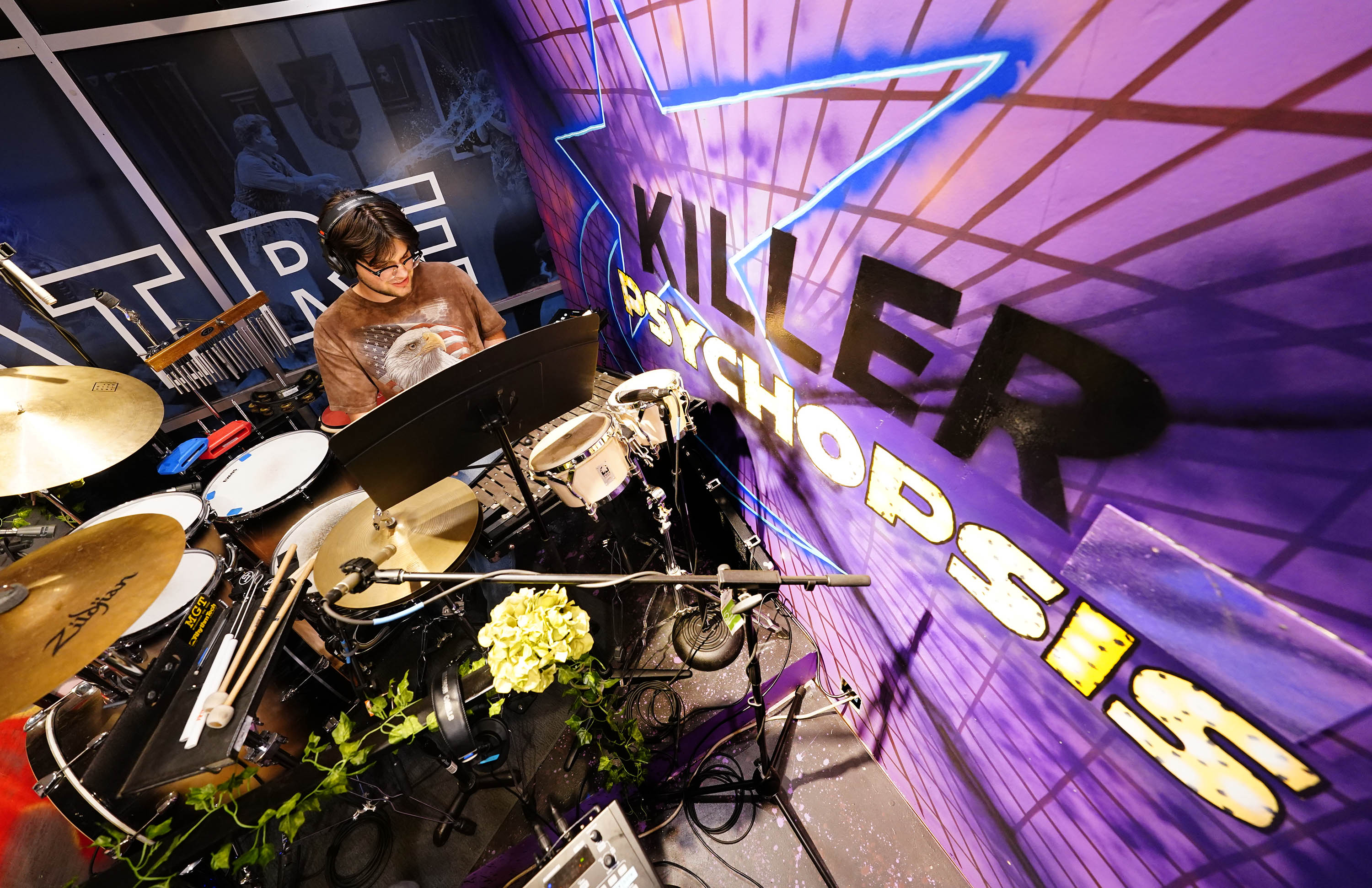 Luke Lundberg plays percussion for the live band the Killer Psychopsis in the lobby of Ethington Theatre during a dress rehearsal for the theatre department’s production of “Little Shop of Horrors” on Nov. 5, 2025. -